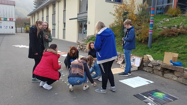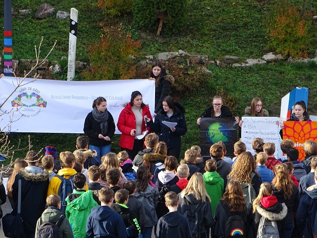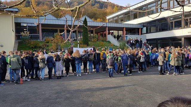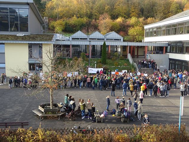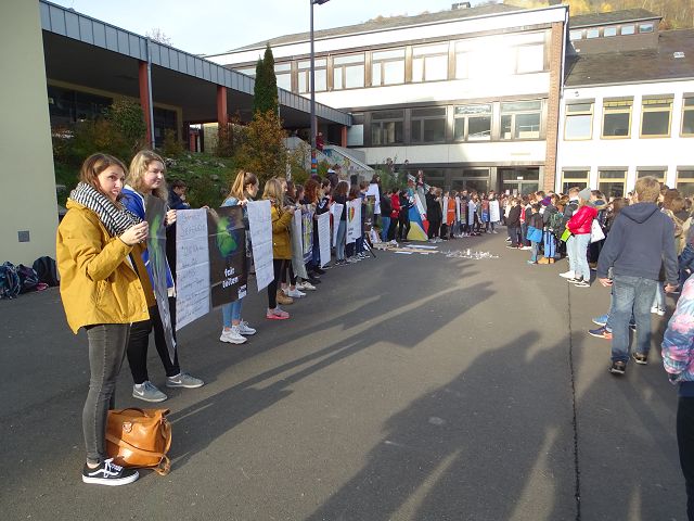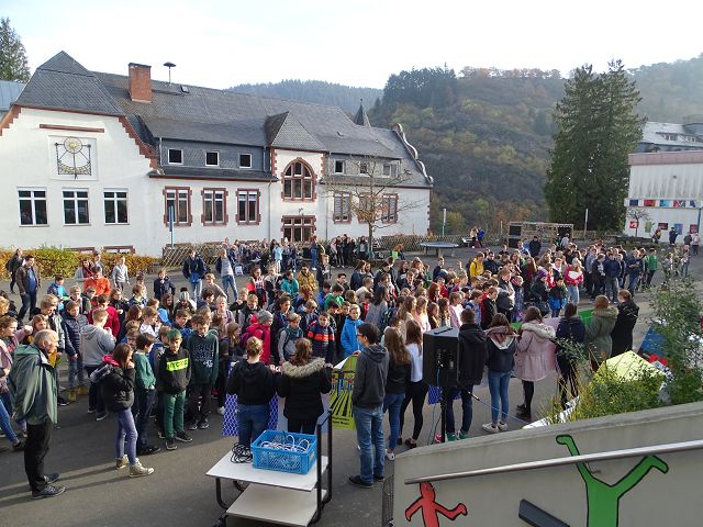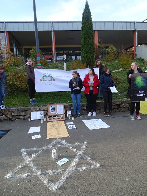 Anlässlich der Pogromnacht von 1938 organisierten die Mitglieder der Schule ohne Rassismus – Schule mit Courage (SoR-) AG des Gymnasiums Traben-Trarbach am 9. November eine Gedenk-Aktion auf dem Schulhof.Ina Werner erläuterte den Begriff Pogrom (Verwüstung, Zerstörung) und die sich danach verschärfende Verfolgung, Ausgrenzung und Deportation der deutschen Bevölkerung jüdischen Glaubens bis hin zur Vernichtung von ca. 6 Millionen Jüdinnen und Juden unterschiedlichster Nationen durch Massenhinrichtungen oder in Konzentrationslagern.