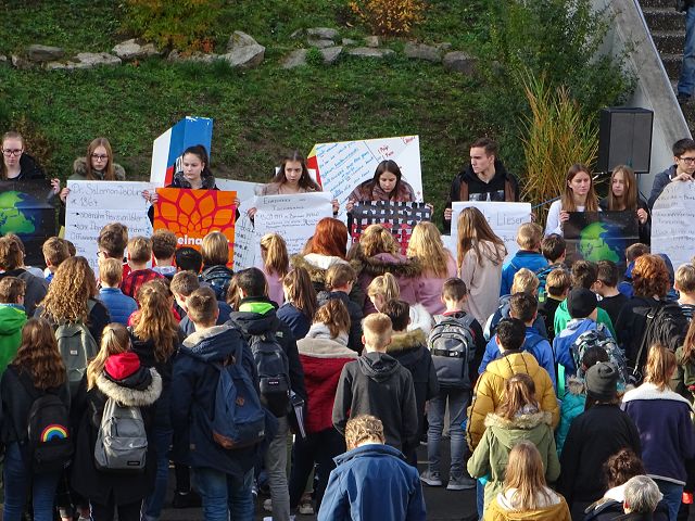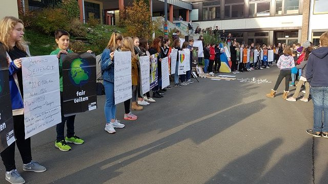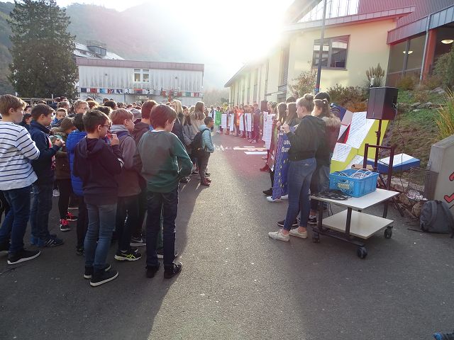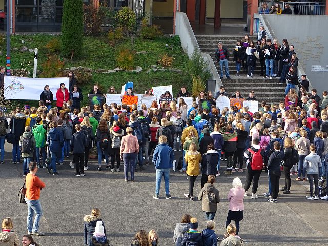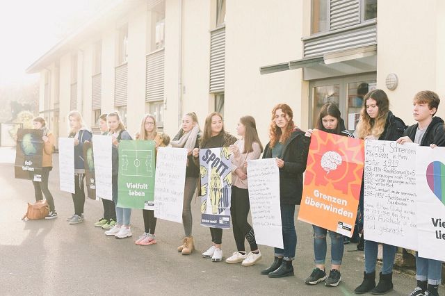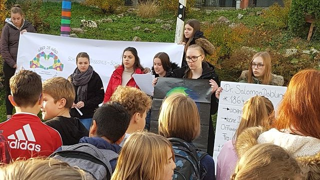 Jule Jäschke las einen erschütternden Zeitzeugenbericht des damals 15jährigen Berliners Ernest Günter Fontheim vom Morgen des 10. Novembers vor. Plakate mit den Namen und Schicksalen der jüdischen Schüler des Gymnasiums und Plakate mit Aufforderungen wie „Toleranz und Vielfalt leben“,“ Neid und Spott – Schluss damit“, „Grenzen überwinden“, „Miteinander“, „Hoffnung teilen“ und „Haltung zeigen“ wurden von 23 weiteren Mitgliedern der SoR-AG hochgehalten.