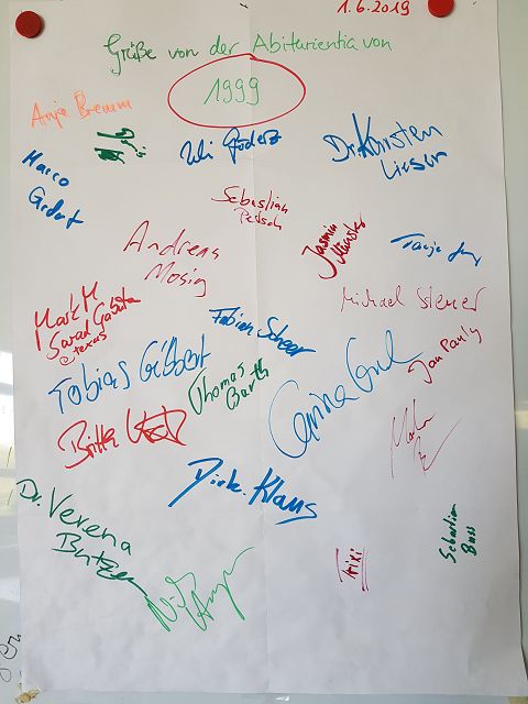 Bei strahlendem Sonnenschein trafen sich Mitglieder der Abiturientia 1999 an ihrer Schule, dem Gymnasium Traben-Trarbach, um sich, bevor sie auf eine Wanderung gingen, an alte Zeiten zu erinnern. Die meisten Ehemaligen waren seit 20 Jahren nicht mehr da gewesen und sehr begeistert über die bauliche Entwicklung ihrer „alten“ Schule. Sie testeten die Sitzplätze im „Grünen Klassenzimmer“, entdeckten in ihrer alten Mensa einen Fitnessraum und waren auch vom Raum der Stille angetan. Gut gelaunt wurde die gesamte Schule erkundet. Bei ortsüblichen Getränken und Häppchen tauschte man sich über den bisherigen Werdegang aus und stellte fest, dass einige sich so gar nicht geändert haben.