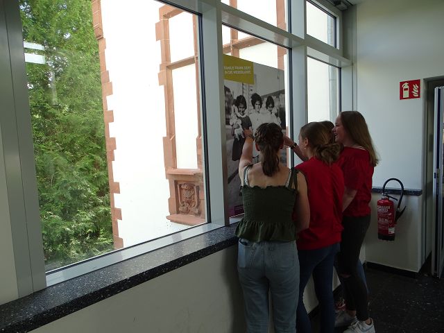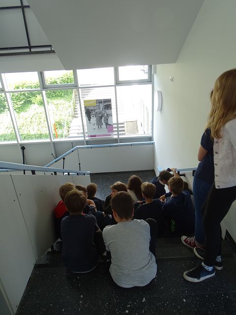 Schüler und Schülerinnen der Klasse 7b/c (Kath. Religion) bereiteten zudem eine Plakat-Ausstellung vor und gestalteten eine Gedankentür. Die Schüler und Schülerinnen der Klassen 6a-c (Kath. Religion) hörten gespannt zu, als mit Hilfe der Plakate die Geschichte Anne Franks erzählt wurde und ergänzten ihre Gedanken und Gefühle dazu an der Tür.