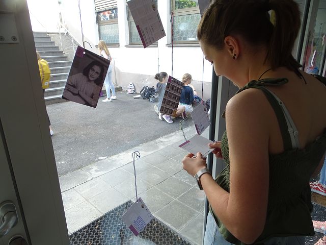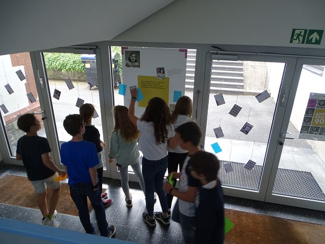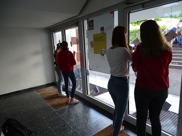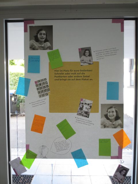 Diese Plakat-Ausstellung zum Anne Frank Tag ist im Treppenhaus der Schule zu sehen. An der Tür zum Schulhof können weiter Postkarten oder Zettel beschriftet werden.