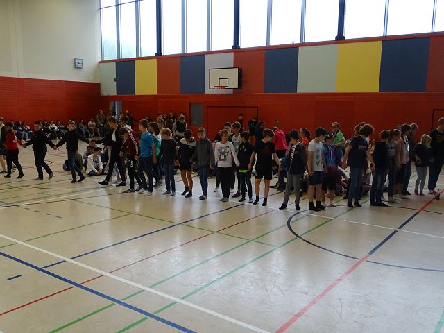 Die Klasse 9 b bereitete im Geschichtsunterricht eine Aktion vor, in der es um die zunehmende Ausgrenzung, Isolierung und Vernichtung der Deutschen jüdischen Glaubens ab 1933 ging. Eindrucksvoll verdeutlichte sie dies der anwesenden Schulgemeinschaft mit Hilfe von Plakaten, auf denen Stationen der Entrechtung, z.B.‚ 1.April 1933 Boykottaufruf gegen jüdische Geschäfte‘, standen und entsprechenden Requisiten. Vier Akteure wurden ausgegrenzt, isoliert, deportiert. Am Ende fand ein Denkprozess statt, die übrigen Akteure holten Deportierte und Ausgegrenzte zurück, die gesamte Schulgemeinschaft fasste sich an den Händen. Mitglieder der SoR-AG lasen dazu Auszüge aus Anne Tagebuch vor und appellierten an alle Anwesenden, auf Mobbing und Diskriminierung zu verzichten, tolerant gegenüber anderen zu sein, damit dass, was Anne Frank geschah, sich nicht wiederholen kann.