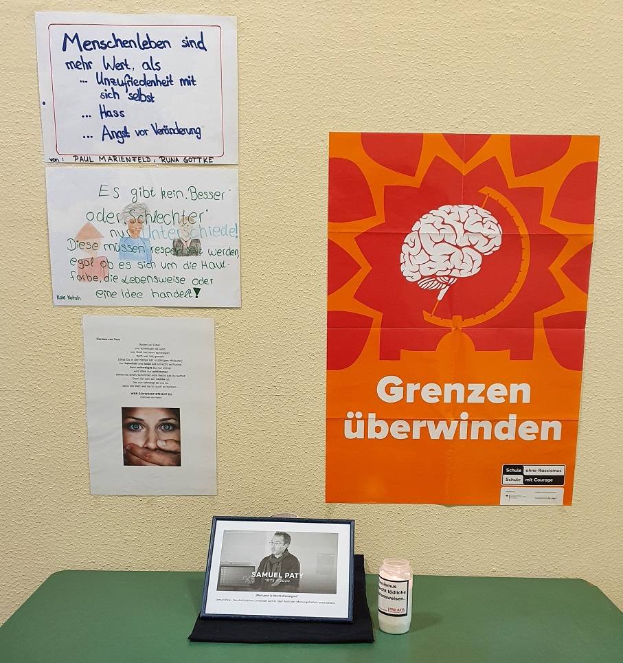 Unter der Federführung von Anastasia Lizdek, Maja Ritz, Katharina Samanek und Peter Tenter rief die SoR- AG mit zur europaweiten Schweigeminute für den ermordeten Lehrer Samuel Paty und zu Toleranz und Miteinander auf.