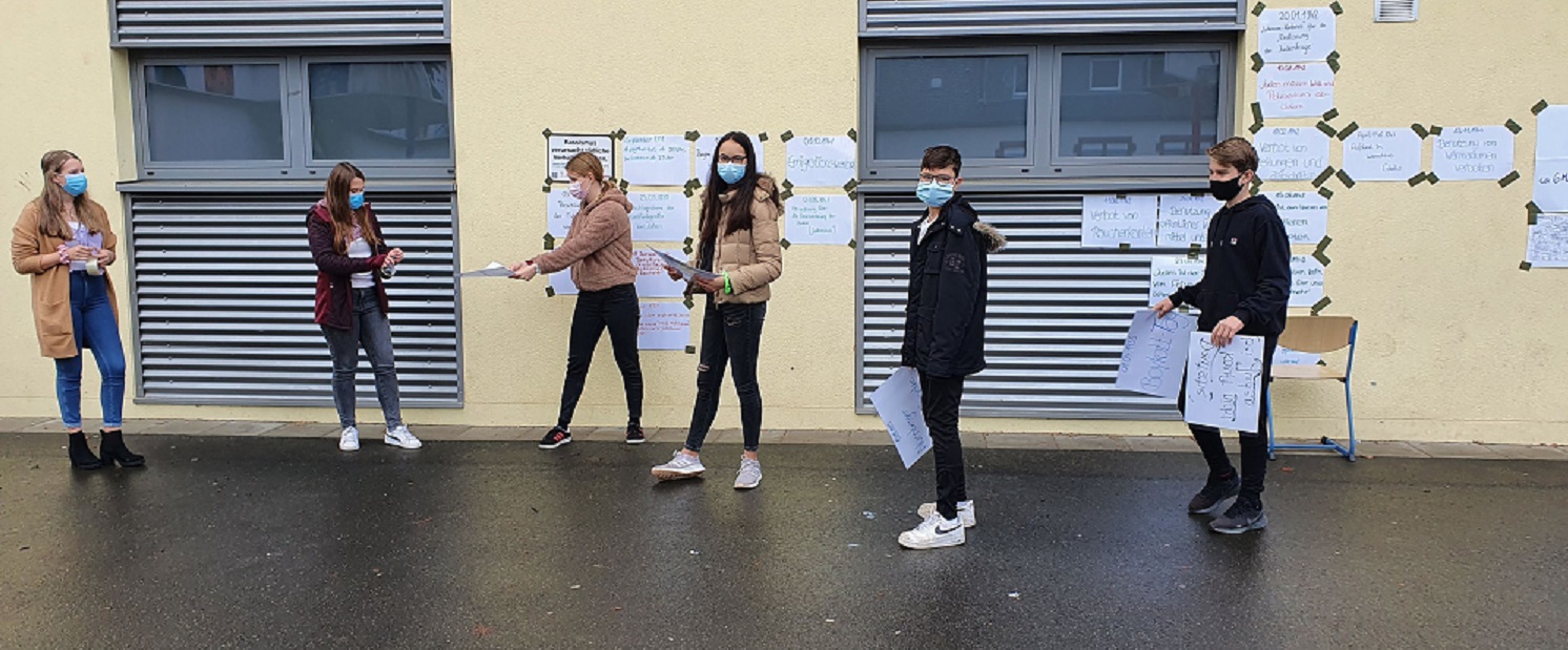 Wie jedes Jahr organisierte die SoR-AG am 9. November die Erinnerung an die Progromnacht von 1938. Mitglieder der AG verlasen per Durchsage die Namen der jüdischen Schüler des Gymnasiums und gestalteten auf dem Schulhof mit viel Abstand eine Gedenkwand der jüdischen Geschichte von 1933 bis zum Holocaust.