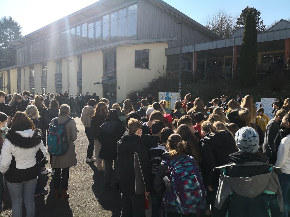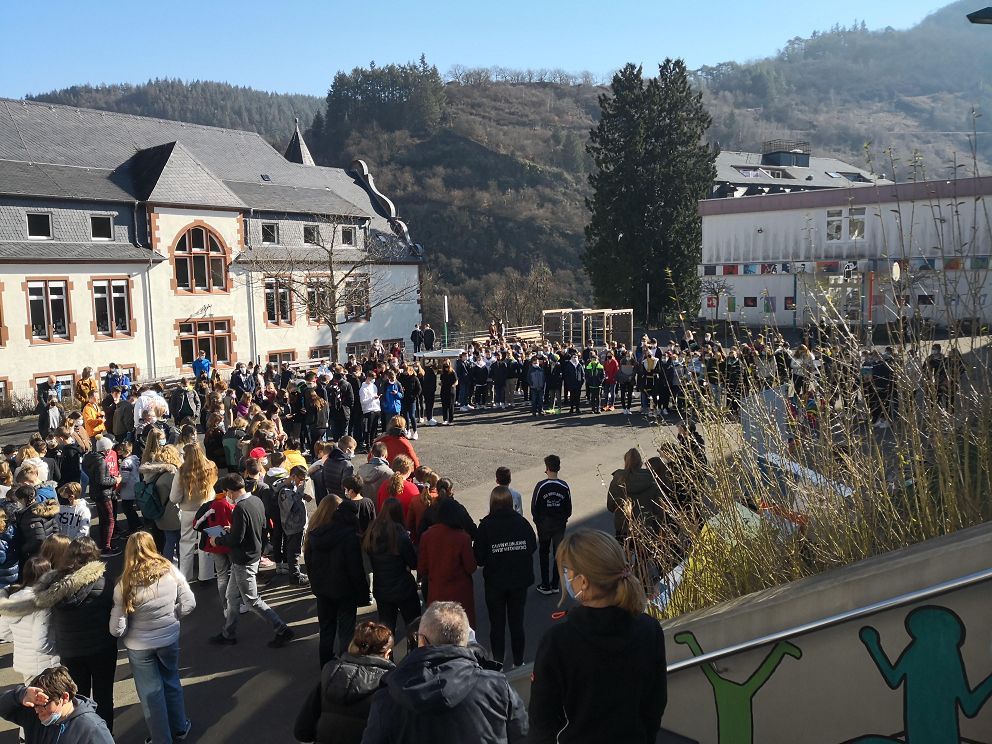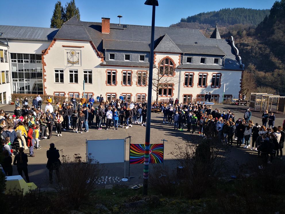 Traben-Trarbach. Geschlossen stellte sich die Schulgemeinschaft des Gymnasium Traben-Trarbach am vergangenen Donnerstag gegen den Krieg in der Ukraine: Die SoR-AG, die SV, verschiedene Fachbereiche sowie Klassen und Kurse organisierten eine Schweigeminute mit einer kurzen Erklärung, einer Theater-Performance und einem gemeinsamen Singen auf dem Schulhof. Zusätzlich wurden die gesammelten Wünsche, Ängste und Hoffnungen vieler Schülerinnen und Schüler auf kleine Papierkerzen geschrieben und von der Klasse 7a (unter der Leitung von Lea Löwen) zu einer großen Kerze zusammengefügt.