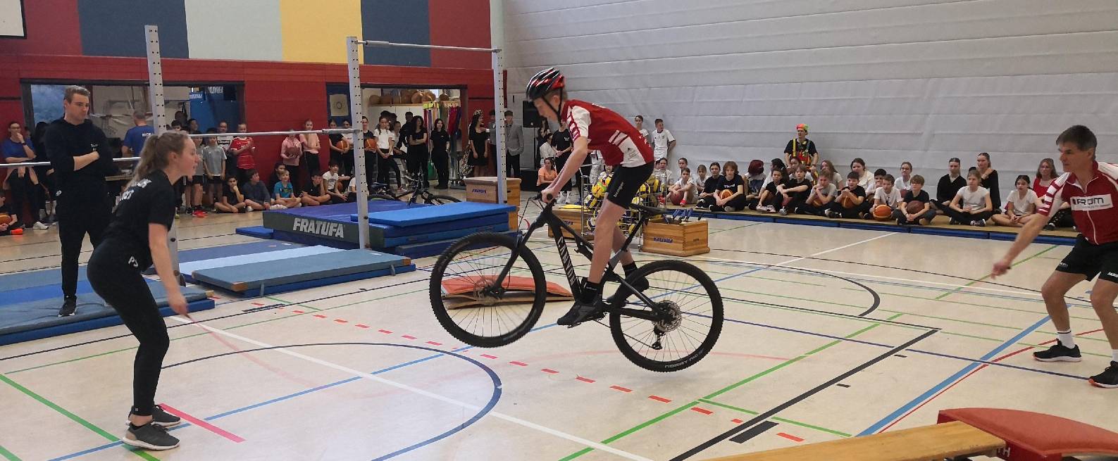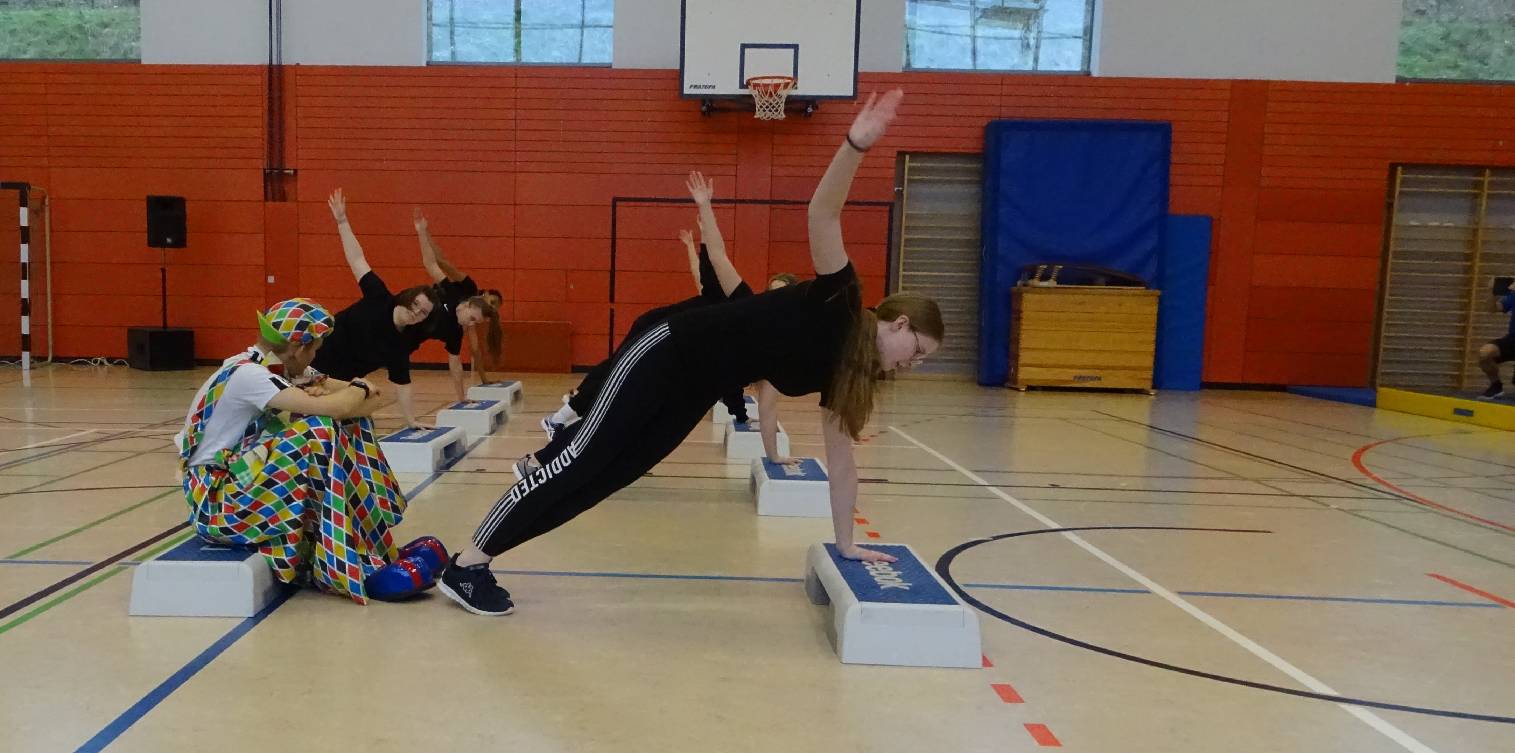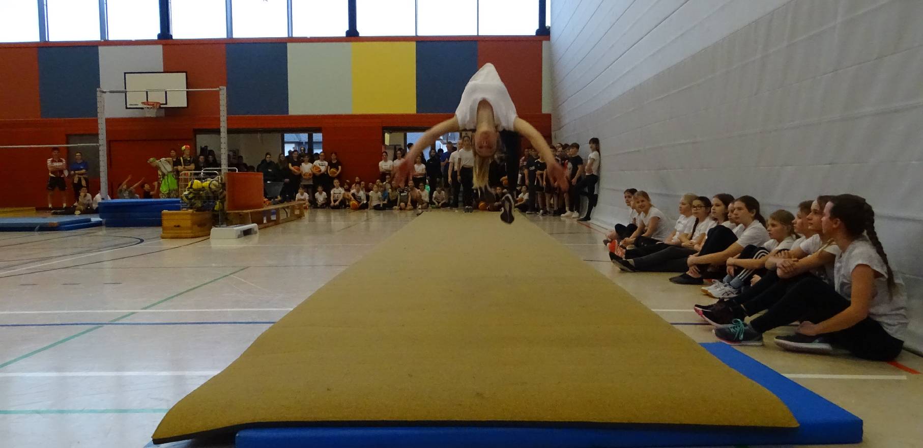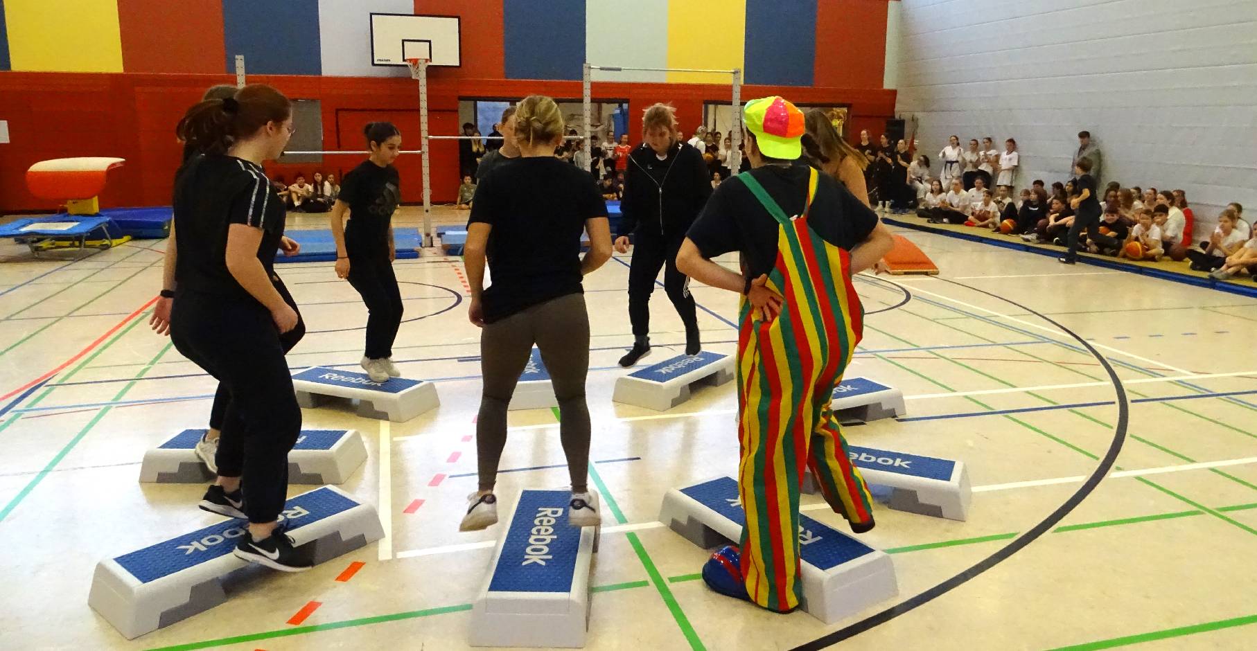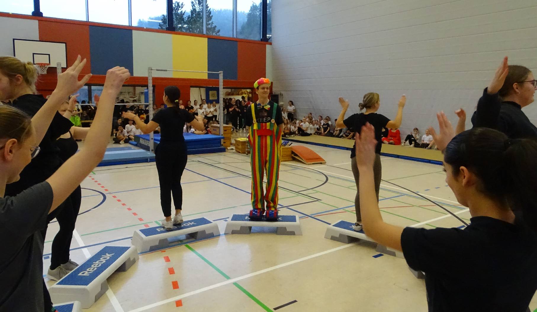 Das Highlight stellte allerdings die halbstündige Sportshow dar, in der das Gymnasium die vielfältigen Aktivitäten und besonderen Leistungen des Sportbereichs zeigte: Eingerahmt von Clownerie und einer lustigen Performance aus dem Darstellenden Spiel zeigten die motivierten Schülerinnen und Schüler aller Jahrgangsstufen Höchstleistungen aus fast allen Bereichen des Sports: Ob Fahrradakrobatik, Karate, Bodenturnen oder Geräteturnen - hier sah man Spaß und Konzentration vereint. Doch auch Tanzen, Basketball, Volleyball, Handball und alle Bereiche der Fitness wurden engagiert präsentiert!