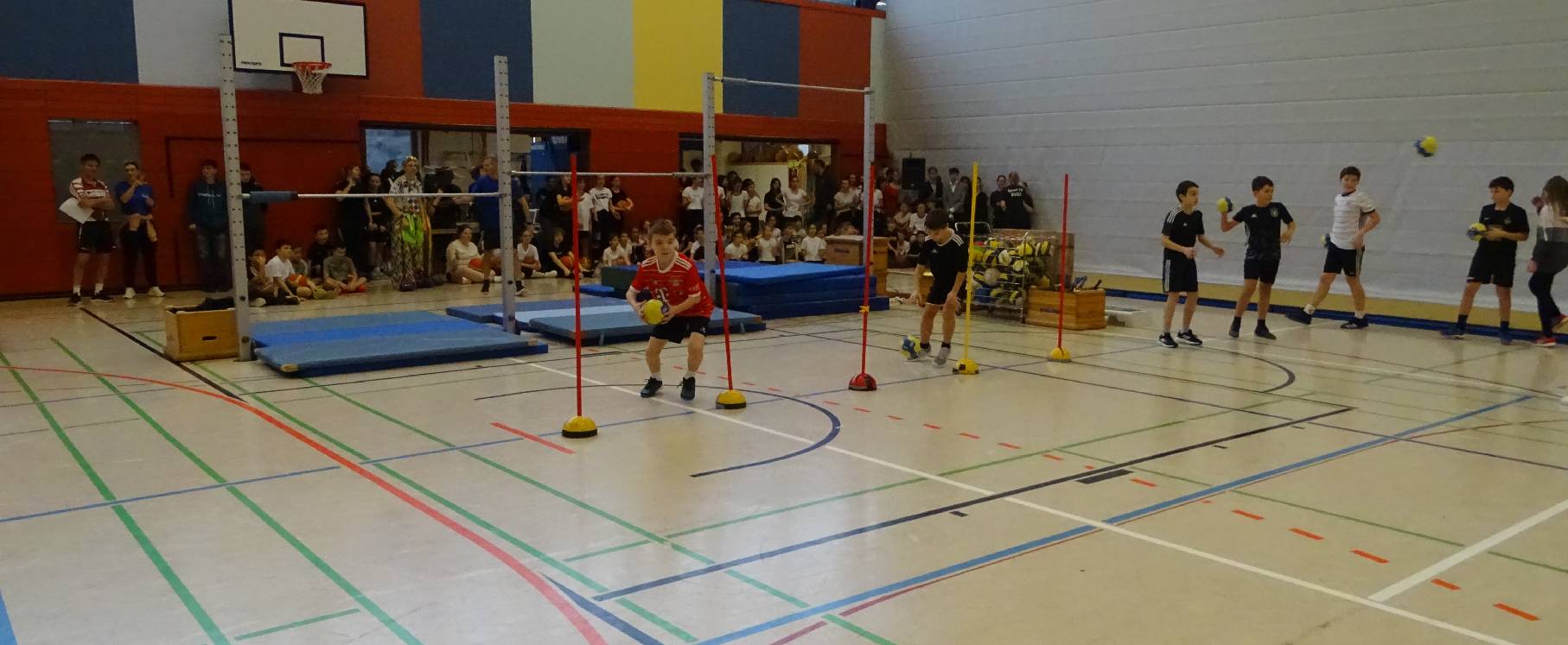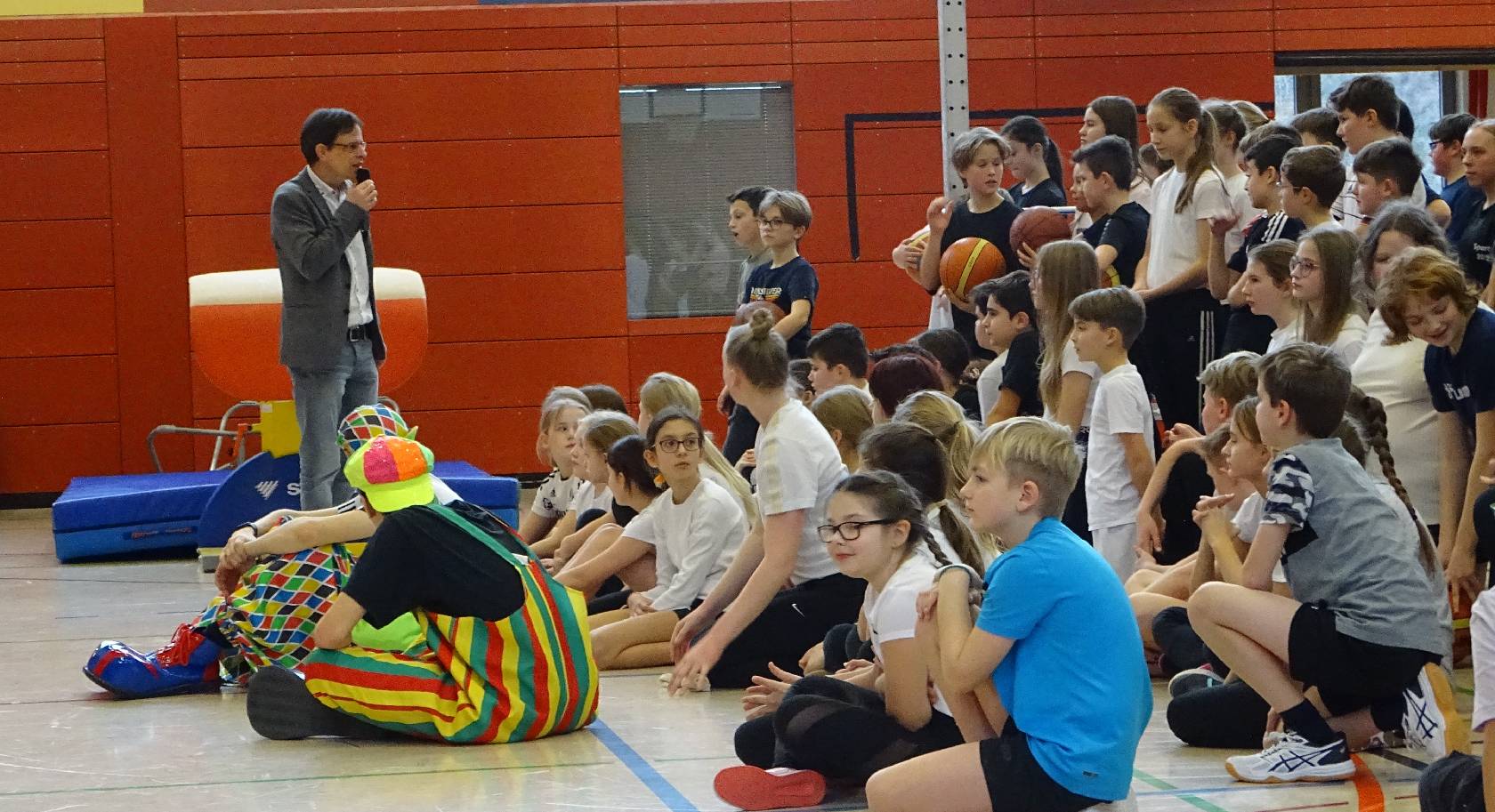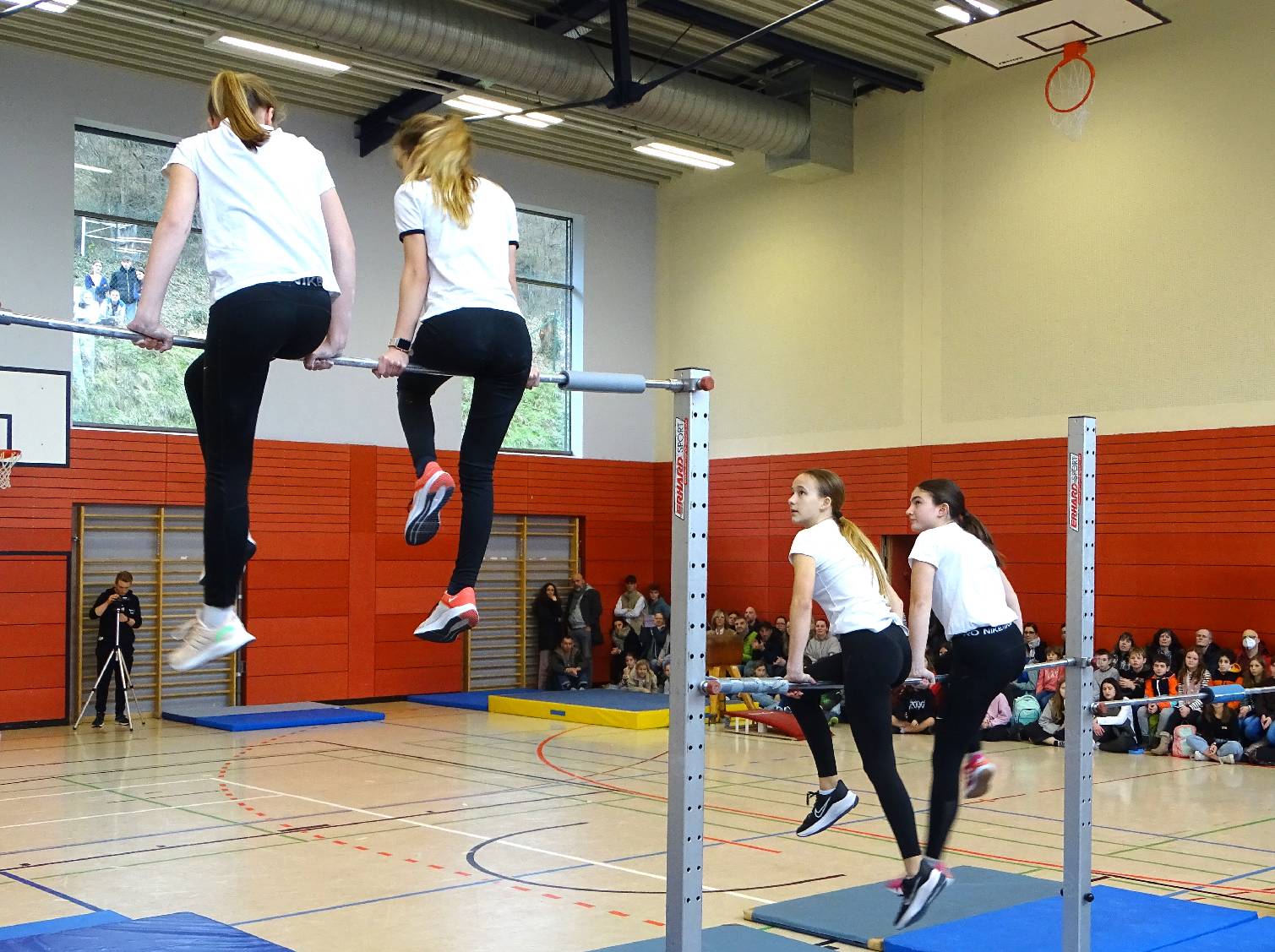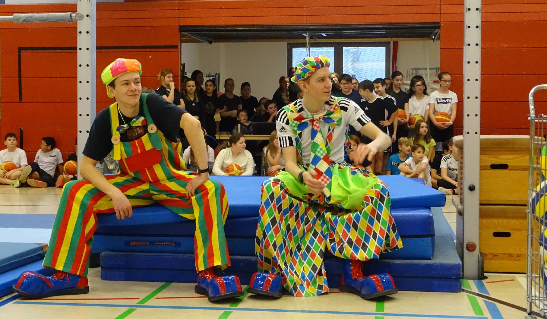 Das Highlight stellte allerdings die halbstündige Sportshow dar, in der das Gymnasium die vielfältigen Aktivitäten und besonderen Leistungen des Sportbereichs zeigte: Eingerahmt von Clownerie und einer lustigen Performance aus dem Darstellenden Spiel zeigten die motivierten Schülerinnen und Schüler aller Jahrgangsstufen Höchstleistungen aus fast allen Bereichen des Sports: Ob Fahrradakrobatik, Karate, Bodenturnen oder Geräteturnen - hier sah man Spaß und Konzentration vereint. Doch auch Tanzen, Basketball, Volleyball, Handball und alle Bereiche der Fitness wurden engagiert präsentiert!