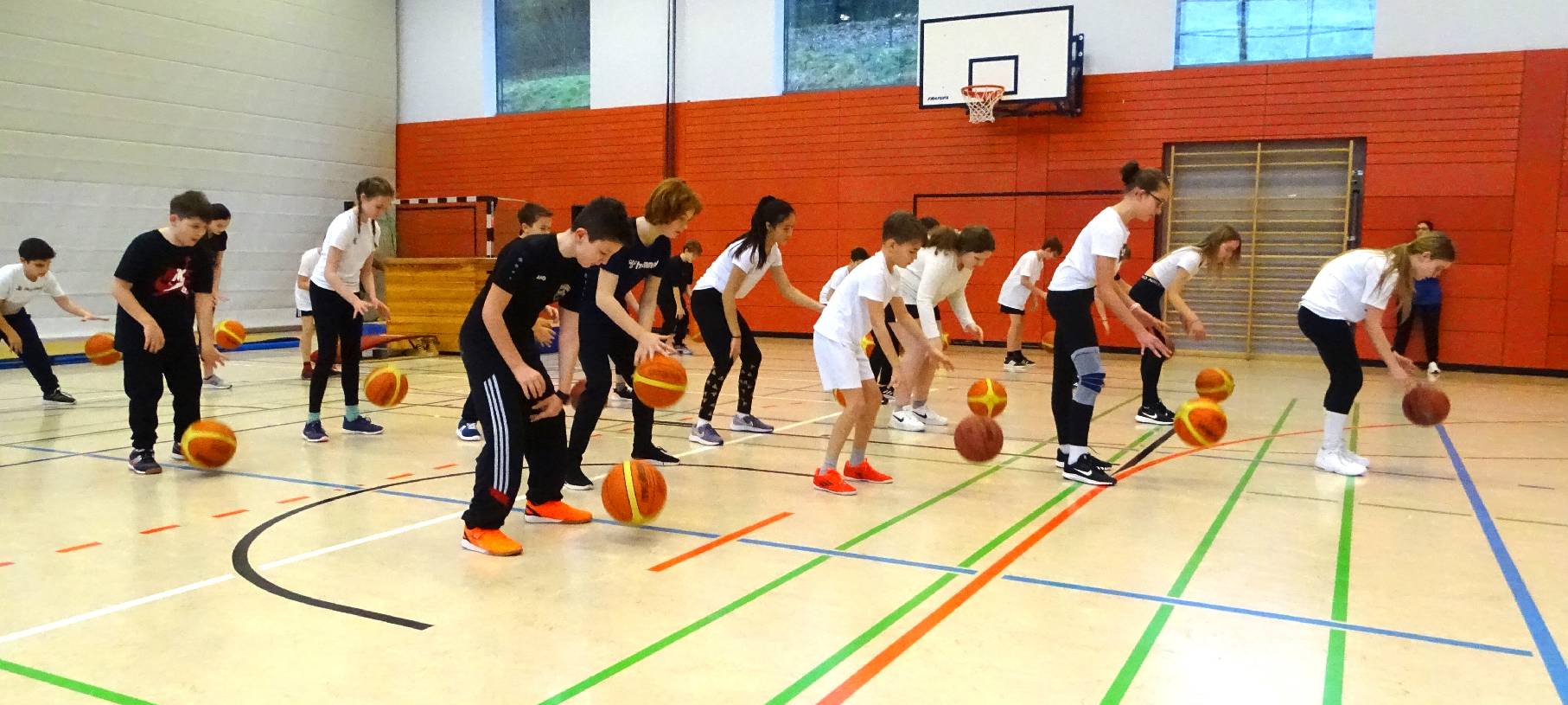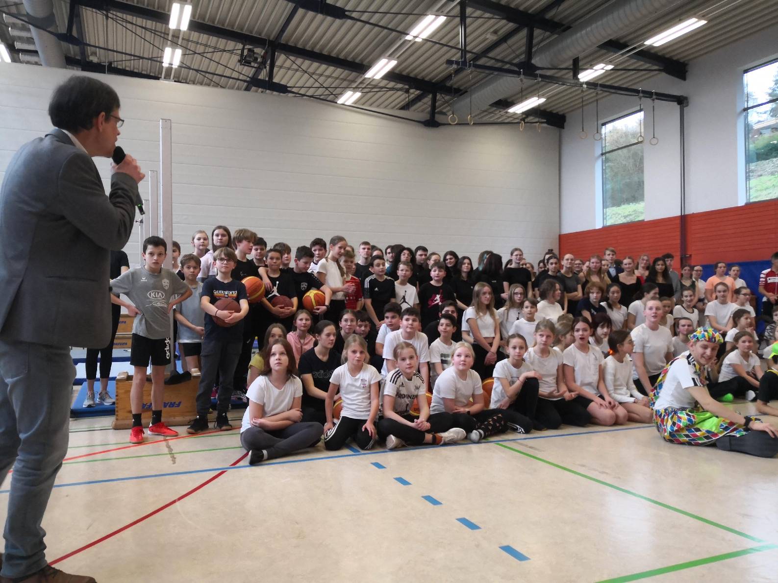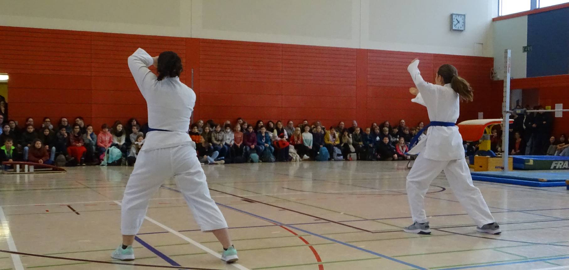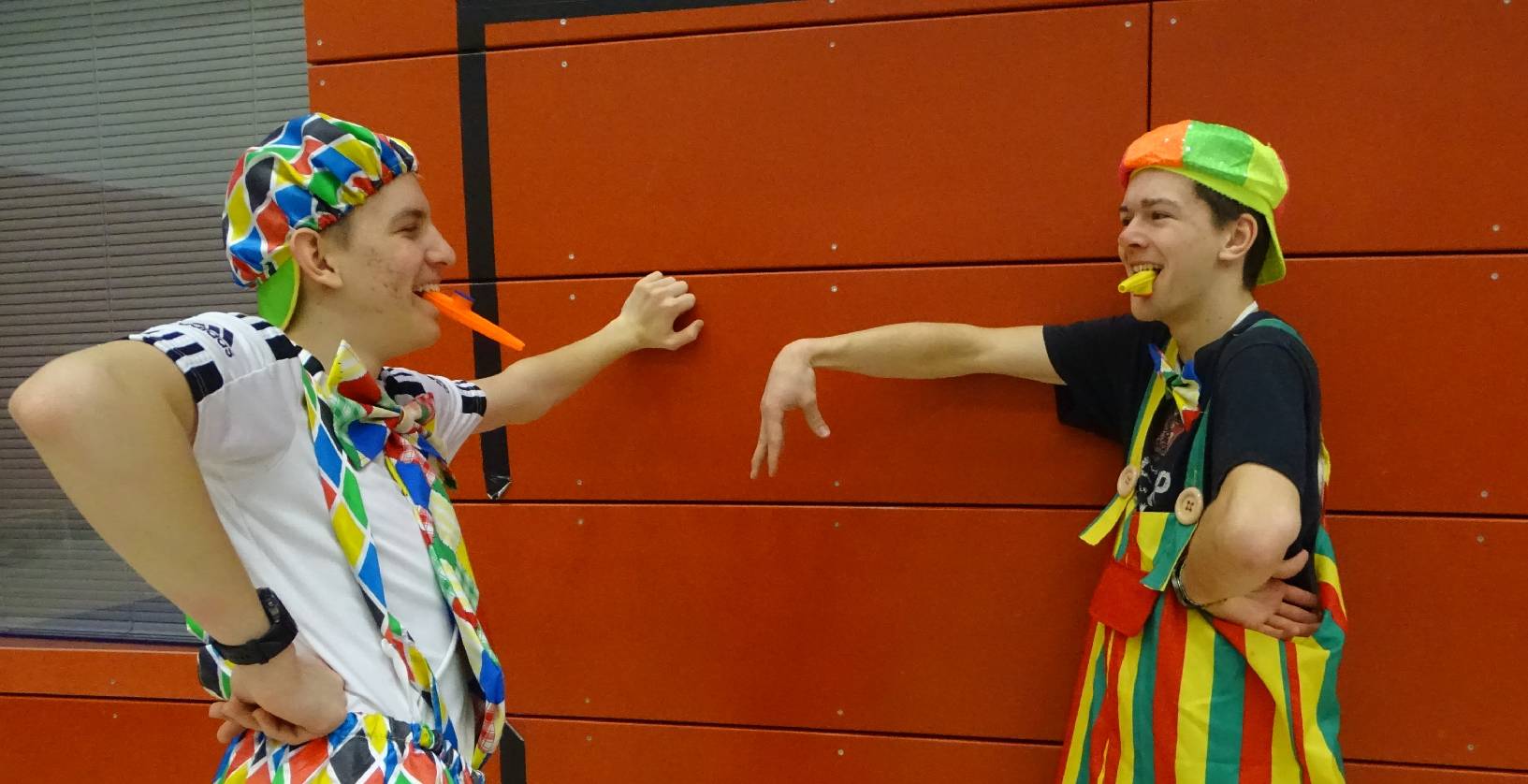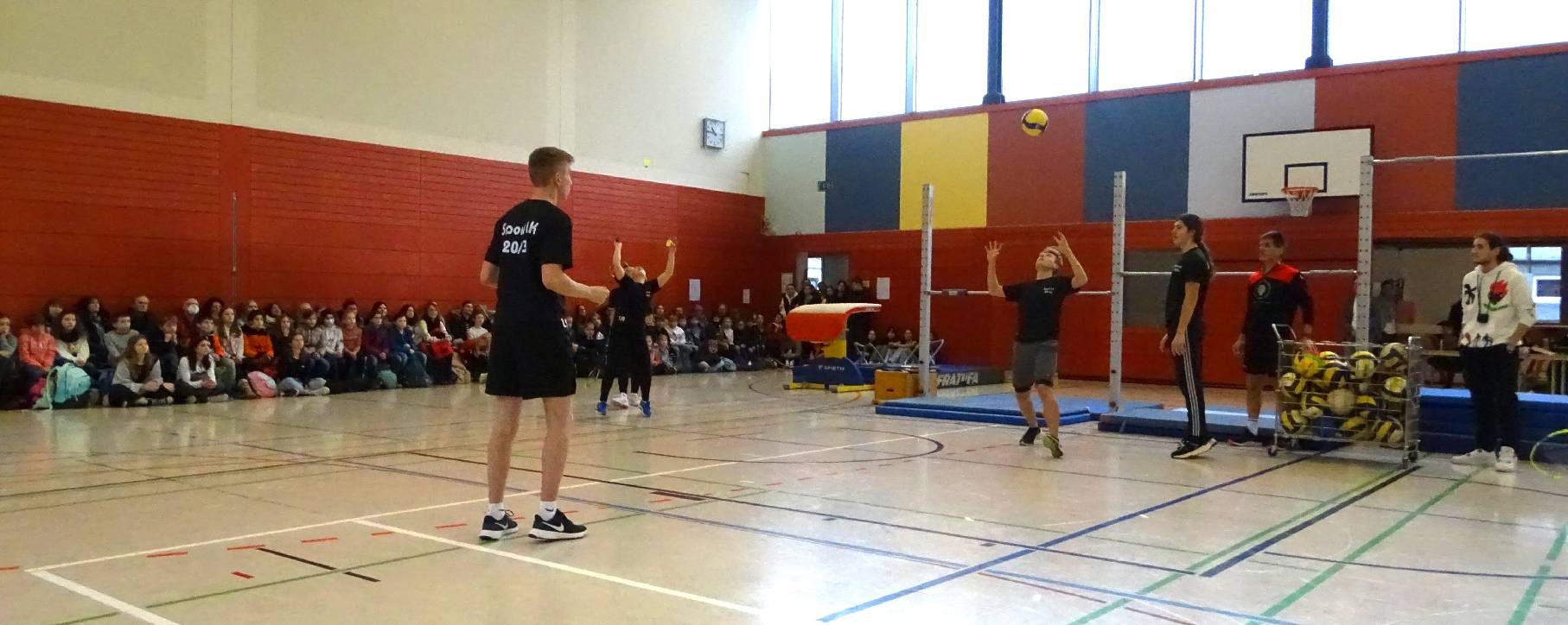 Das Highlight stellte allerdings die halbstündige Sportshow dar, in der das Gymnasium die vielfältigen Aktivitäten und besonderen Leistungen des Sportbereichs zeigte: Eingerahmt von Clownerie und einer lustigen Performance aus dem Darstellenden Spiel zeigten die motivierten Schülerinnen und Schüler aller Jahrgangsstufen Höchstleistungen aus fast allen Bereichen des Sports: Ob Fahrradakrobatik, Karate, Bodenturnen oder Geräteturnen - hier sah man Spaß und Konzentration vereint. Doch auch Tanzen, Basketball, Volleyball, Handball und alle Bereiche der Fitness wurden engagiert präsentiert!