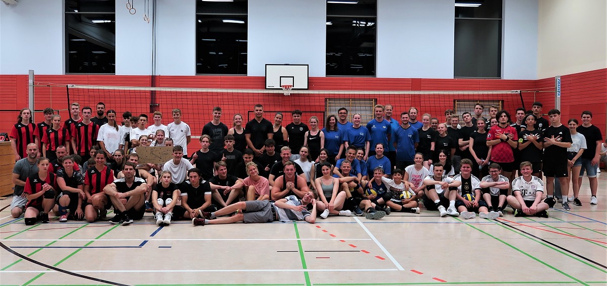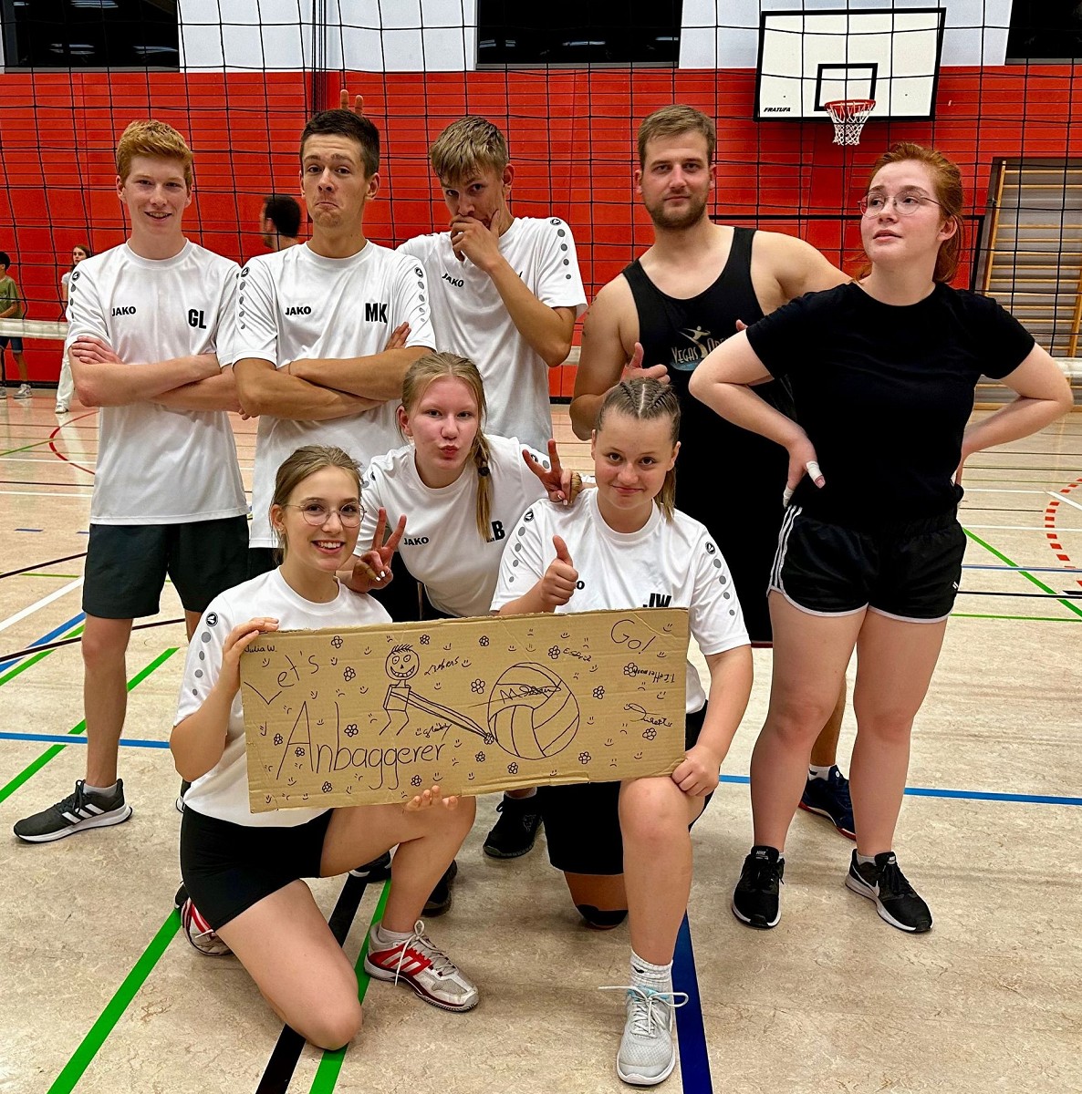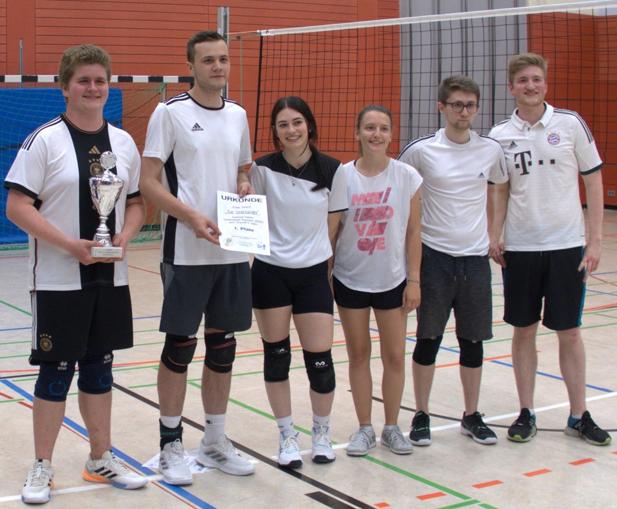 Das Turnier endete nach hart umkämpften, sehr knappen Halbfinalspielen erst nach Mitternacht: In einem packenden Endspiel setzte sich das Team „Spätzünder“ (s. Foto) gegen die „Banditen“ verdientermaßen durch. Es war eindeutig das Team, in dem am besten ausgeprägt war, was das Volleyballspiel auszeichnet und was wir im Schulsport vermitteln wollen: Teamgeist und Fair Play!