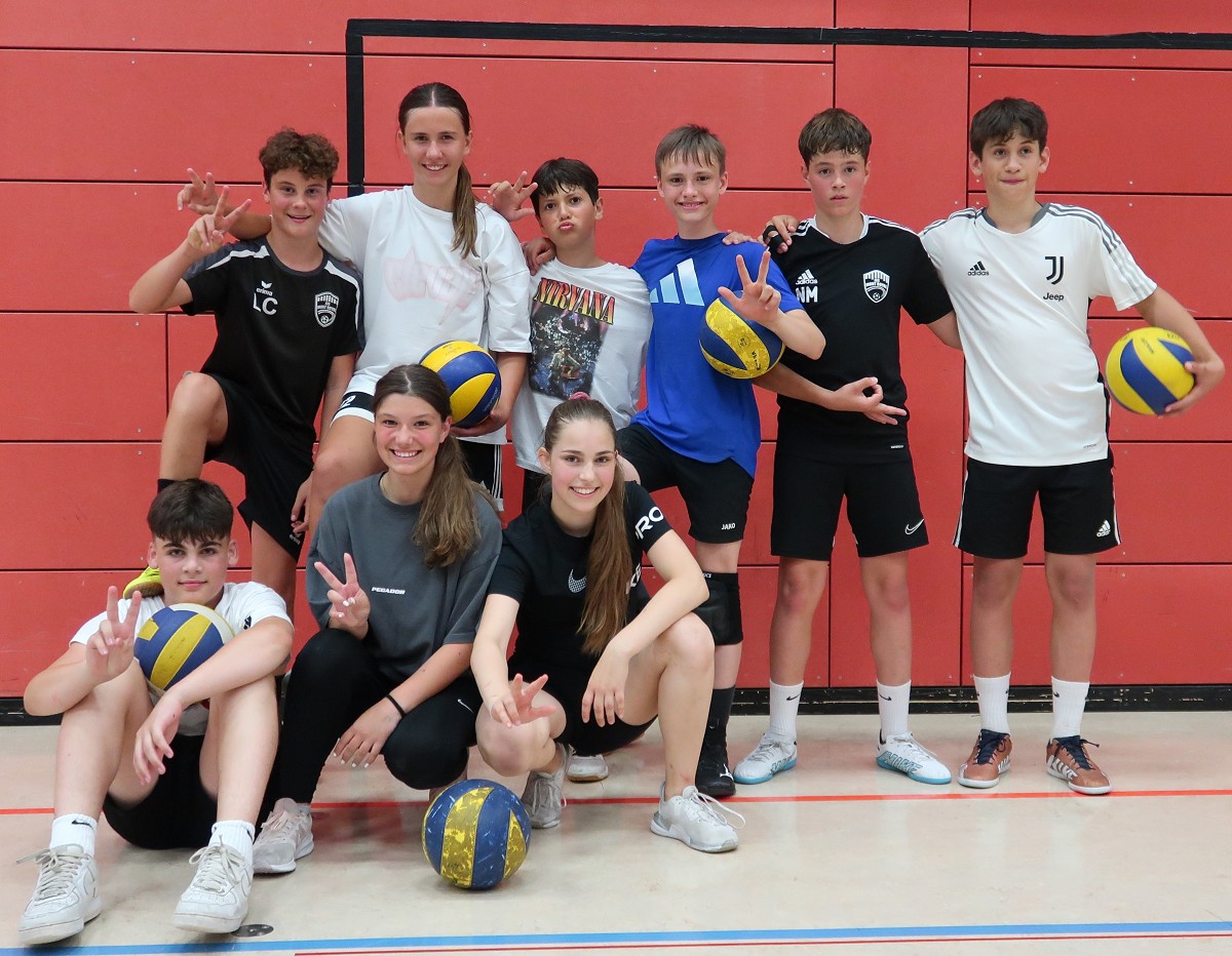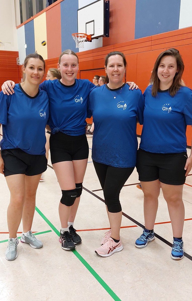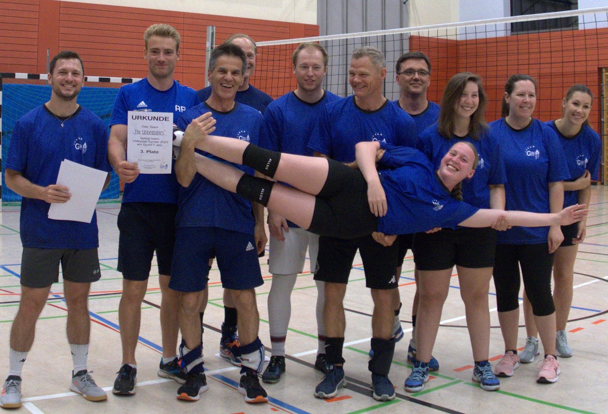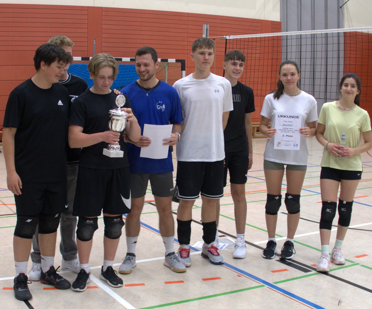 Das Turnier endete nach hart umkämpften, sehr knappen Halbfinalspielen erst nach Mitternacht: In einem packenden Endspiel setzte sich das Team „Spätzünder“ (s. Foto) gegen die „Banditen“ verdientermaßen durch. Es war eindeutig das Team, in dem am besten ausgeprägt war, was das Volleyballspiel auszeichnet und was wir im Schulsport vermitteln wollen: Teamgeist und Fair Play!