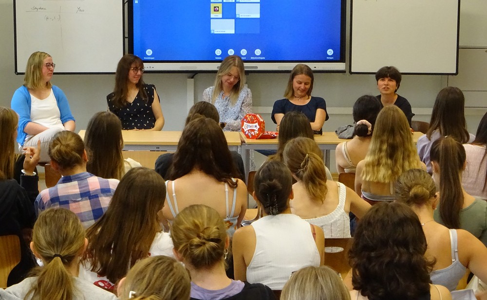 Die Fragen bezogen sich dann zum Beispiel auf das Auslandsstudium: Diejenigen, die das ausprobiert hatten, rieten dazu, denn das sei toll und garantiere viele neue Erfahrungen. Oft werde auch Englisch gesprochen, aber das müsse man vorher gut recherchieren. Wenn man die Sprache des Landes lernen wolle, dann müsse man aktiv werden und Unterhaltungen in der Landessprache einfordern, berichtete Anna Hüllein, die noch in Norwegen promoviert. Wichtig sei die Unterstützung der Eltern, auch wenn diese zweifelten. Und manchmal müsse man sich auch mal gegen seine Eltern stellen und eigene Wege gehen.