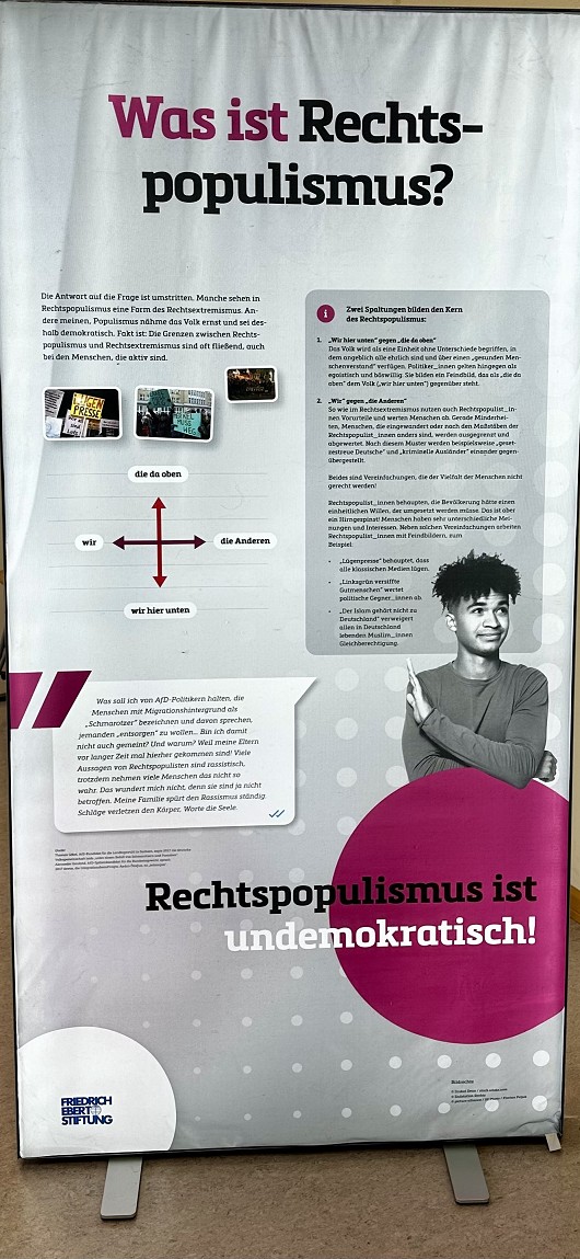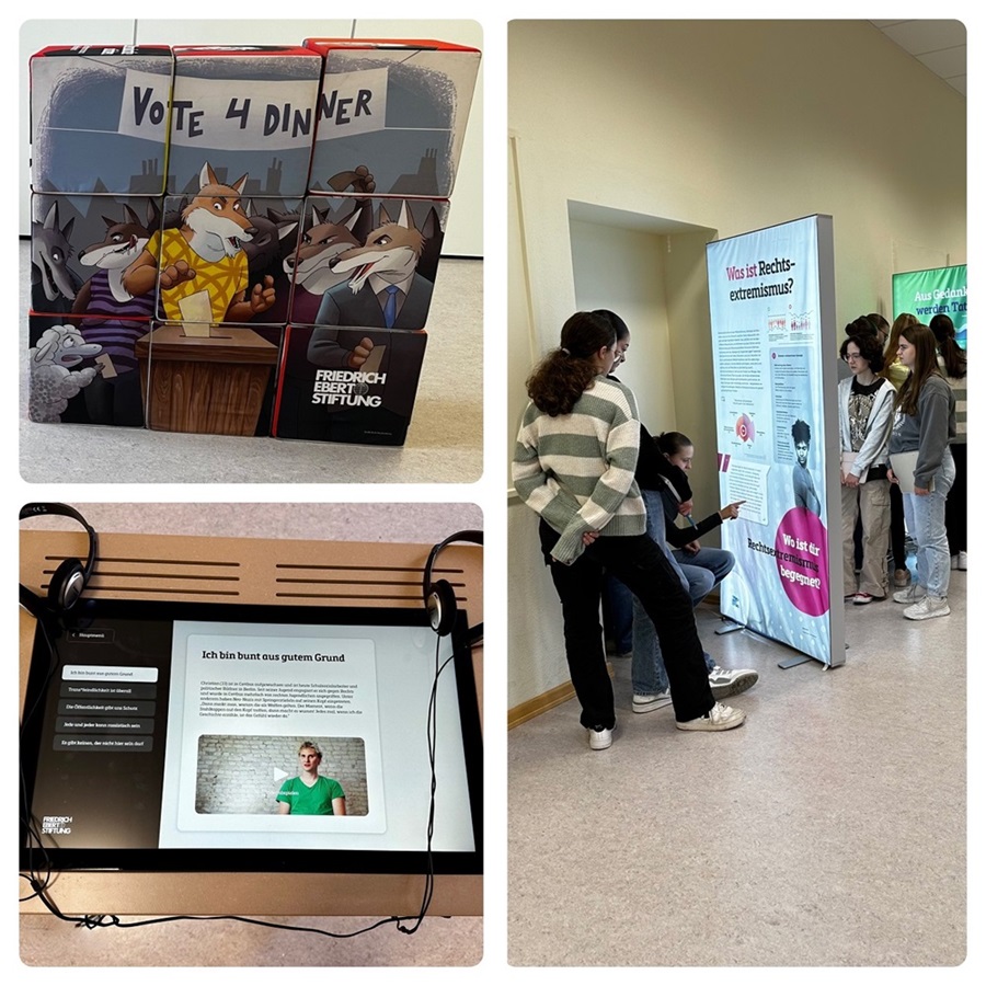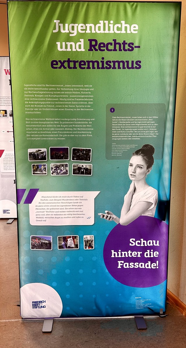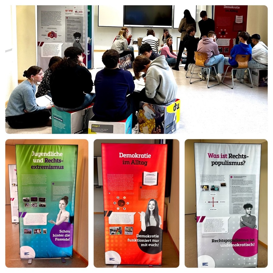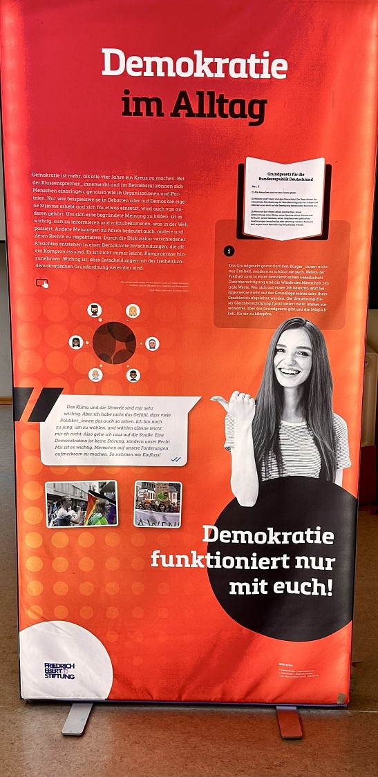 In der Zeit vom 31. Oktober bis zum 13. November 2023 fand im Raum A 103 des Gymnasiums Traben-Trarbach eine ganz besondere Ausstellung statt, die Schüler*innen und Lehrer*innen gleichermaßen berührte. Diese Wanderausstellung des Regionalbüros RLP/Saar der Friedrich-Ebert-Stiftung zeigte die Bedeutung der Demokratie für unsere Gesellschaft auf und thematisierte die Gefahren, die vom Rechtsextremismus ausgehen.