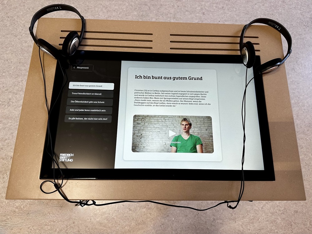Ein beeindruckender Bestandteil der Ausstellung war auch der Medientisch, der den Besucher*innen die Möglichkeit bot, Zeitzeugen und Betroffene rechter Gewalt zu hören. Außerdem fanden sich hier Informationen über lokale Entwicklungen und Anlaufstellen für eigenes Engagement. Besonders bemerkenswert waren außerdem die interaktiven „Würfel“ mit verschiedenen Fragen und Aufgabenstellungen zur Demokratie. Diese regten die Besucher*innen zum Austausch an und sie erwiesen sich als äußerst effektives Instrument, um Wissen zu erweitern und eigenes Denken zu hinterfragen.
