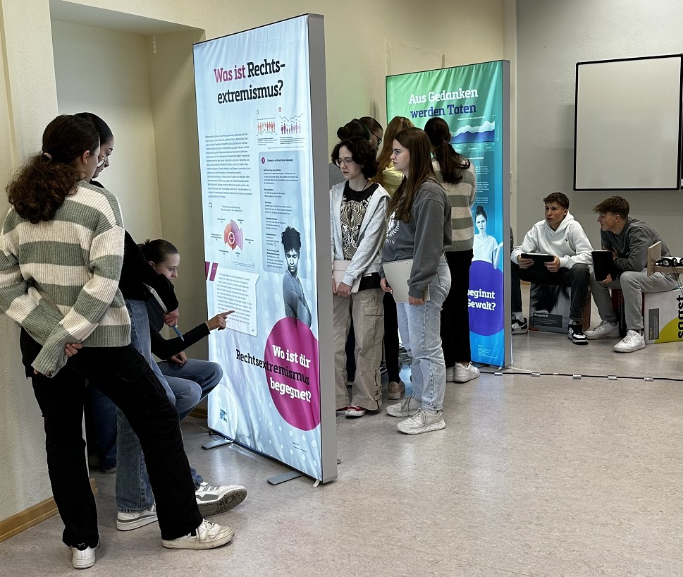 Die Ausstellung bestand aus sechs beleuchteten Tafeln, die die Grundlagen unserer Demokratie und die Bedrohung durch Rechtsextremismus eindrücklich darstellten. Schüler*innen vom siebten Schuljahr bis hin zu Leistungs- und Grundkursen der Oberstufe hatten die Gelegenheit, sich auf eine informative Reise zu begeben.
