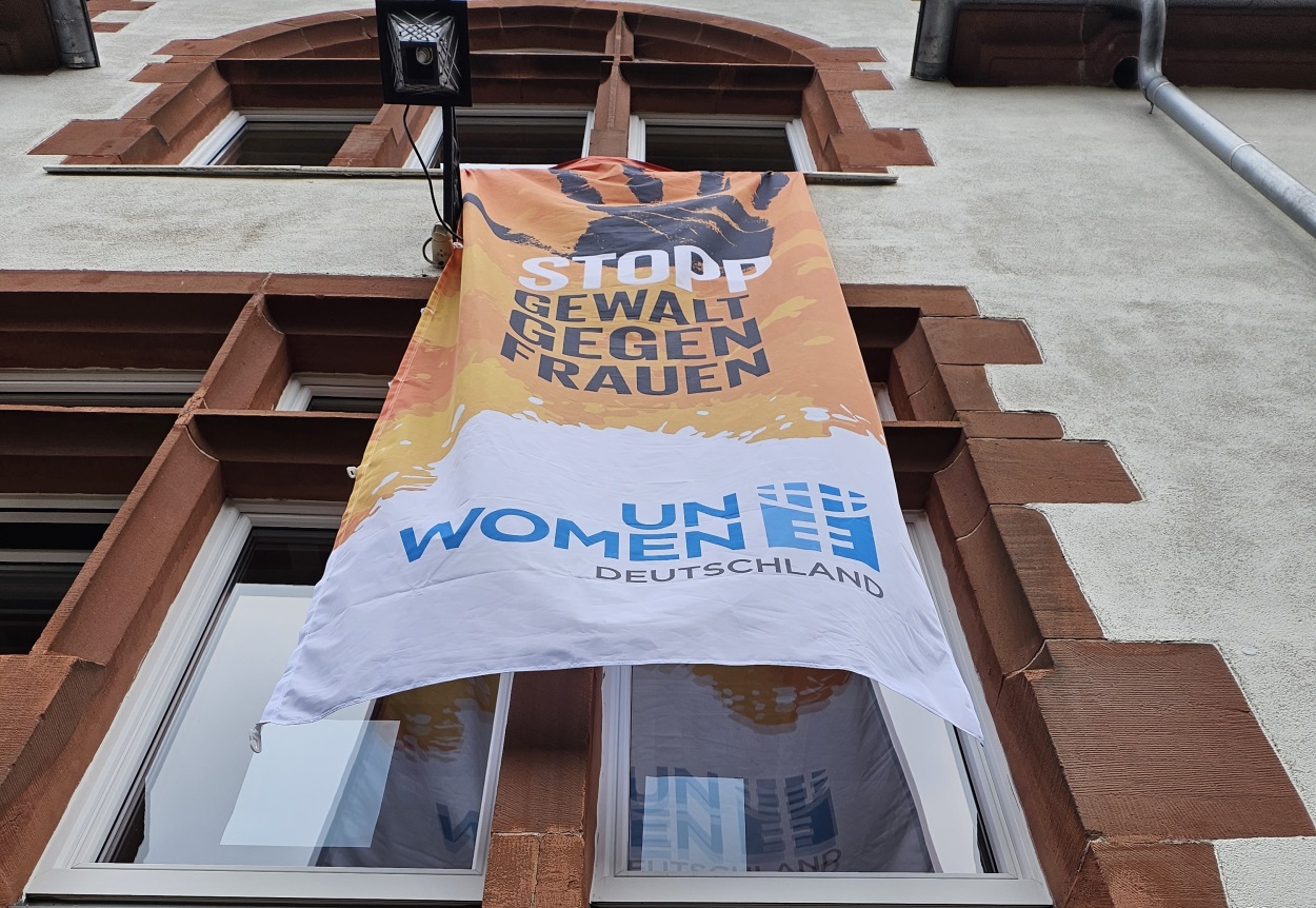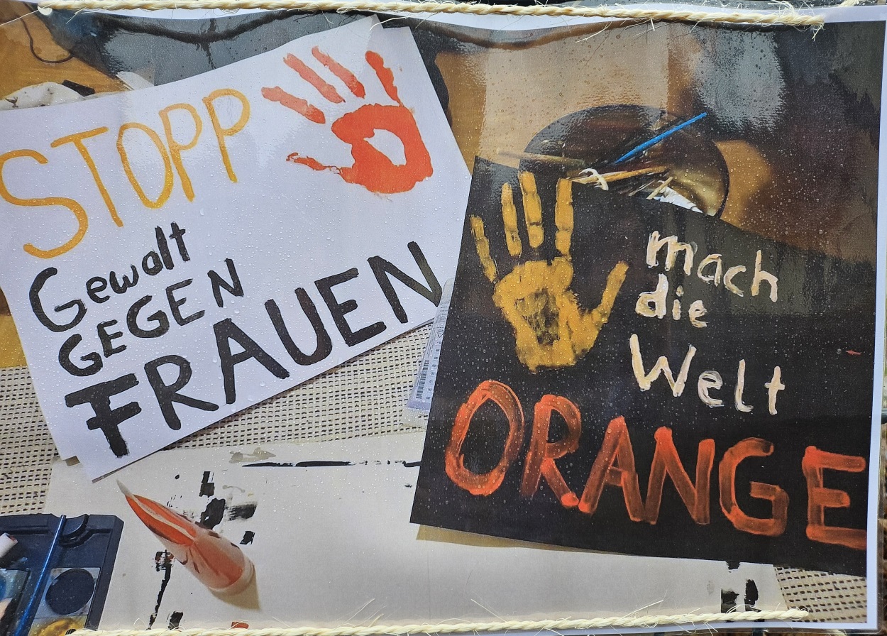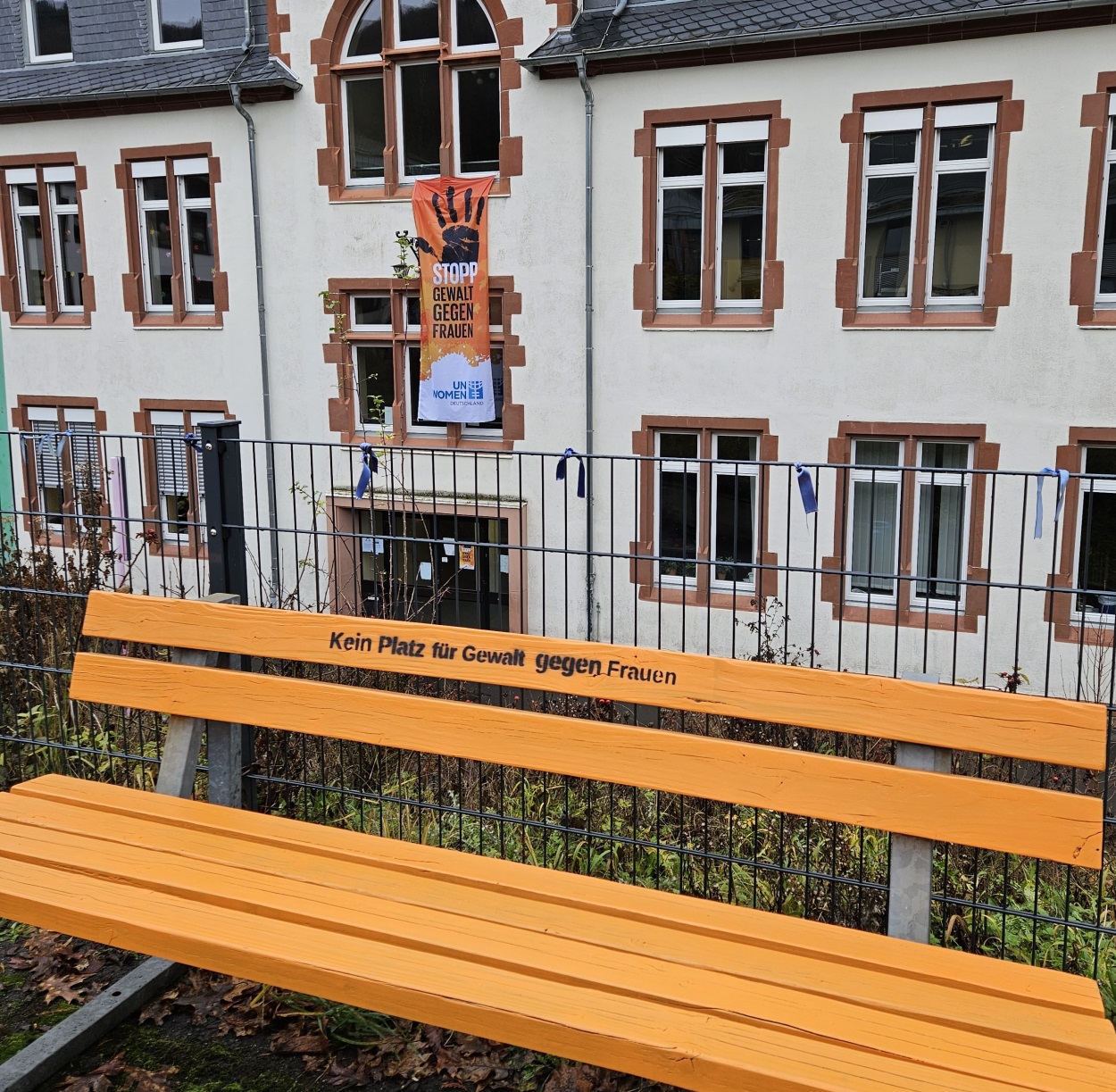 „In diesem Jahr stellt UN Women Deutschland die Gewalt gegen Frauen und Mädchen im öffentlichen Leben – inklusive der digitalen Welt – in den Fokus der Orange The World Kampagne und wir, als Schule ohne Rassismus-AG schließen uns heute an. Wir haben Plakate und eine Fahne aufgehängt, und eine Bank zum Zeichen unserer Solidarität orange gestrichen. Die UN-Kampagne „Orange The World“ macht seit 1991 auf Gewalt aufmerksam: vom Internationalen Tag zur Beendigung der Gewalt gegen Frauen am 25. November bis zum 10. Dezember, dem Tag der Menschenrechte. Sie ist seit 2008 Teil der „UNiTE to End Violence against Women“ Kampagne des UN-Generalsekretärs, die von UN Women durchgeführt wird.“ (https://unwomen.de/orange-the-world-2023/)
