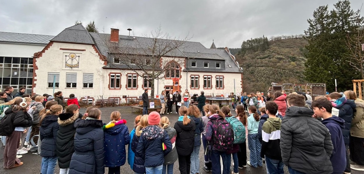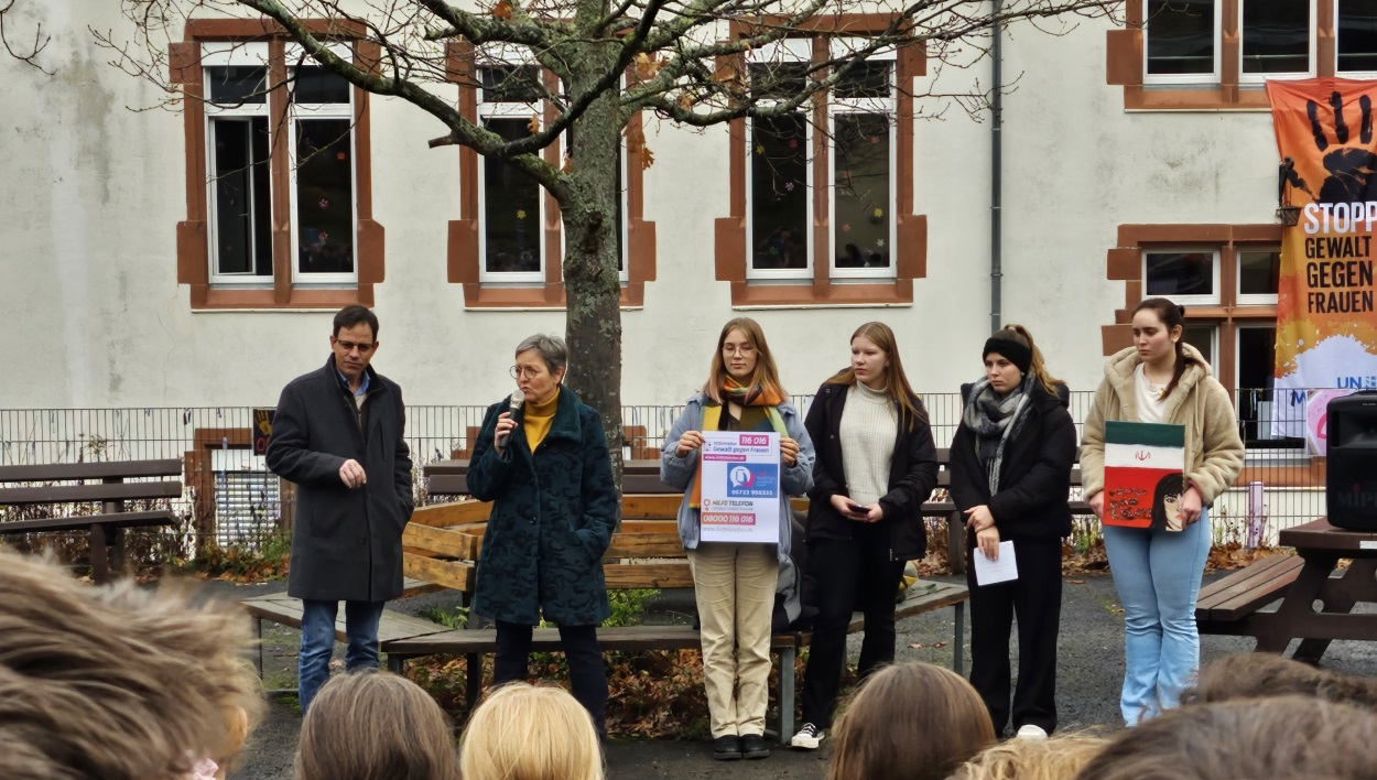 Die Sensibilisierung für Gewalt gegen Frauen bleibt eine Herausforderung auch in unserer Gesellschaft, denn jede dritte Frau in Deutschland ist im Laufe ihres Lebens mindestens einmal von Gewalt betroffen. Alle vier Minuten erlebt eine Frau Partnerschaftsgewalt. Es ist deshalb entscheidend, einen Raum zu schaffen, in dem solche sensiblen Angelegenheiten angesprochen und diskutiert werden können. Diesen Raum nutzten die Schülerinnen und Schüler des GymTT in ihrer Kritischen Pause unter der Überschrift: Gewalt gegen Frauen geht uns alle an! Vor der versammelten Schülerschaft auf dem Schulhof des Moselgymnasiums wurde eine Erklärung verlesen, in der es unter anderem hieß:
