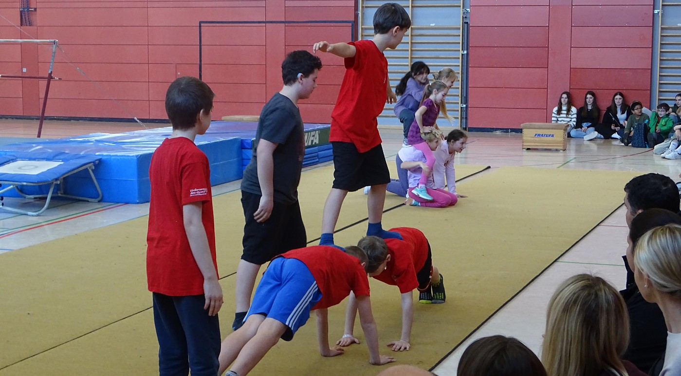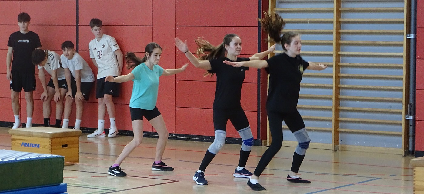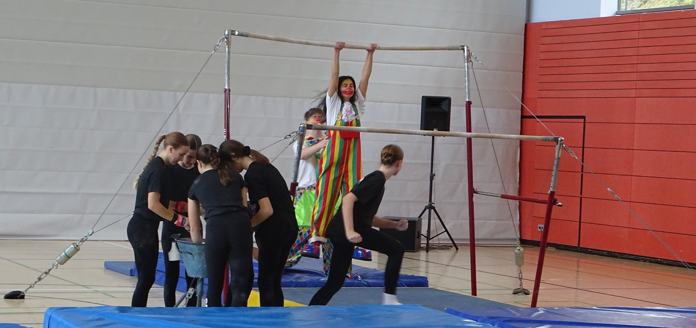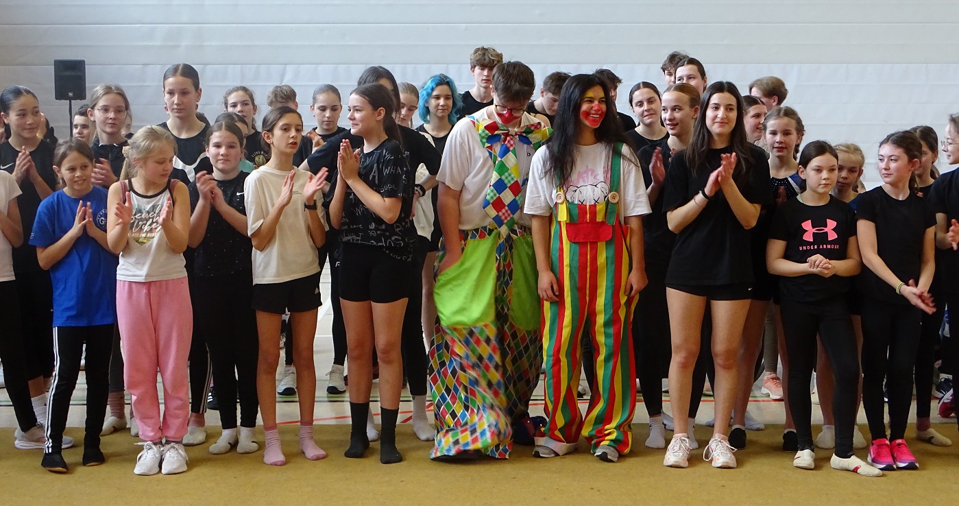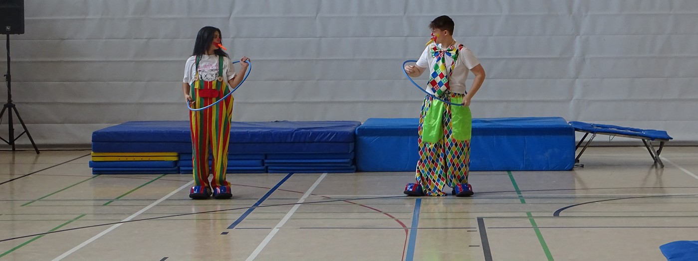 So erlebten Kinder und Eltern einen rundum gelungenen Schnuppertag, bei dem das Highlight die halbstündige Sportshow darstellte, in der das Gymnasium die vielfältigen Aktivitäten und besonderen Leistungen des Sportbereichs zeigte: Eingerahmt von Clownerie zeigten die motivierten Schülerinnen und Schüler aller Jahrgangsstufen Höchstleistungen aus fast allen Bereichen des Sports: Ob Akrobatik, Rope-Skipping, Tanzen, Handball, Volleyball, Boden- oder Geräteturnen - hier konnte man ablesen, wie sich Spaß und Motivation mit sportlicher Kompetenz und Konzentration vereinten.
