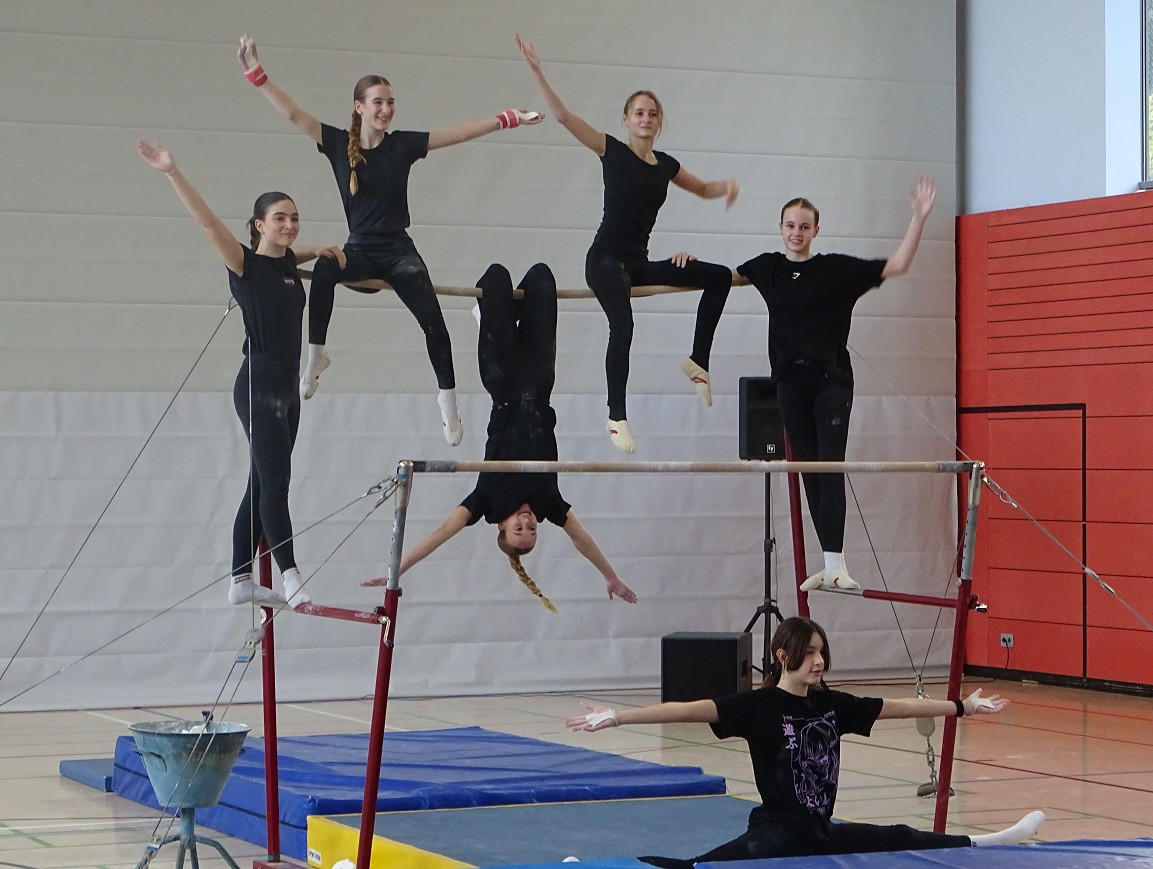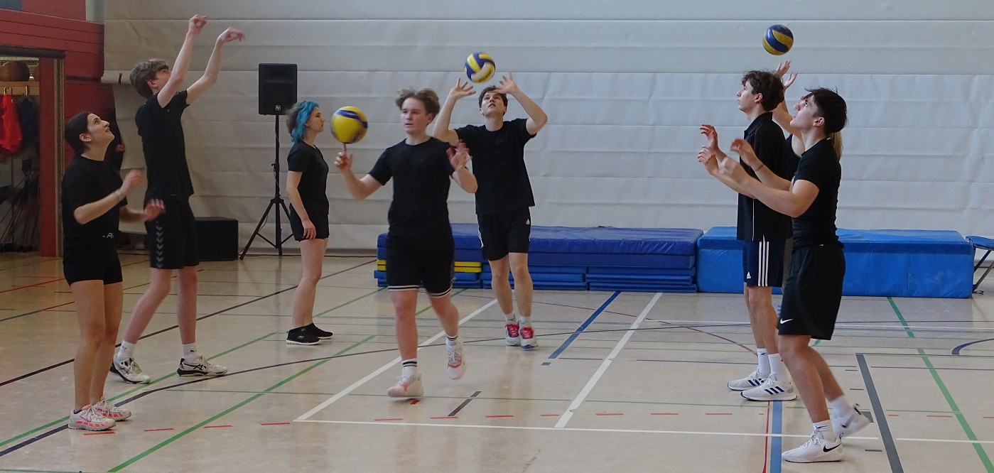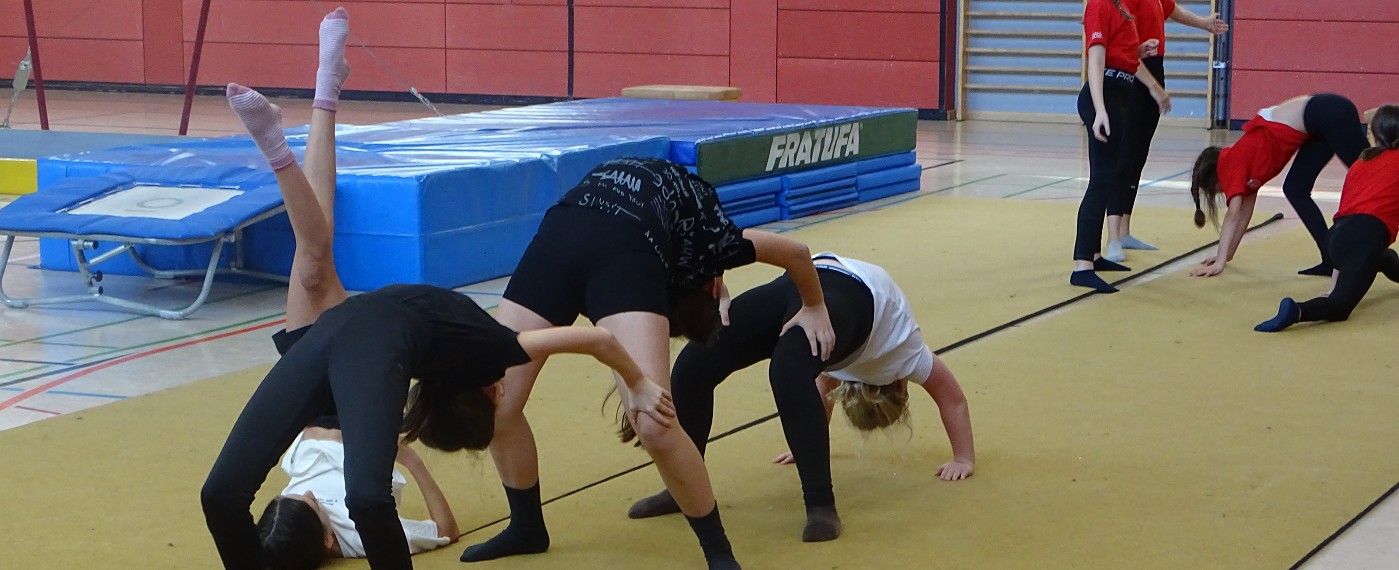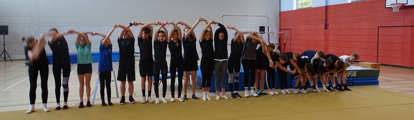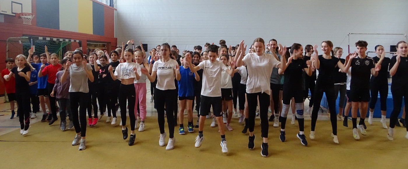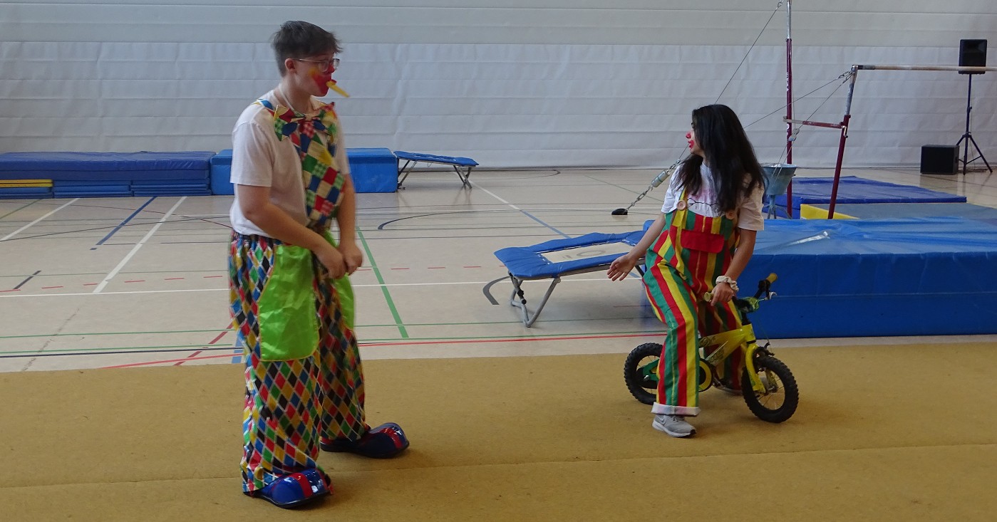 So erlebten Kinder und Eltern einen rundum gelungenen Schnuppertag, bei dem das Highlight die halbstündige Sportshow darstellte, in der das Gymnasium die vielfältigen Aktivitäten und besonderen Leistungen des Sportbereichs zeigte: Eingerahmt von Clownerie zeigten die motivierten Schülerinnen und Schüler aller Jahrgangsstufen Höchstleistungen aus fast allen Bereichen des Sports: Ob Akrobatik, Rope-Skipping, Tanzen, Handball, Volleyball, Boden- oder Geräteturnen - hier konnte man ablesen, wie sich Spaß und Motivation mit sportlicher Kompetenz und Konzentration vereinten.