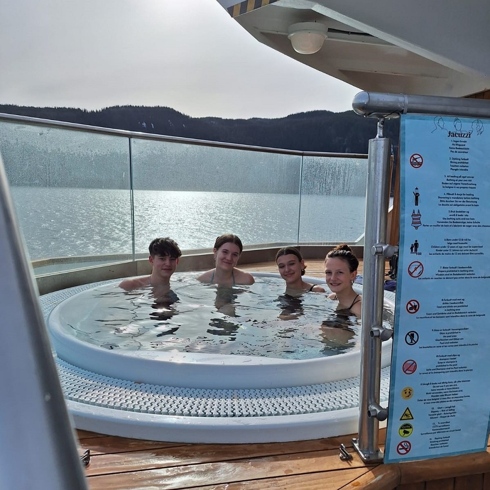 Unsere Fahrt ist noch lange nicht zu Ende. Aber wir befinden uns auf der letzten Etappe der Hinfahrt: Auf der “Nordnorge”, einem der vielen Schiffe der Hurtigrouten. Die Sonne scheint und mit der richtigen Kleidung kann man die norwegische Küstenlandschaft in den Deckchairs an sich vorbeiziehen lassen. Wer eher zu den Frostbeulen zählt, kann aber auch einen der Außen-Jacuzzis auf Deck 6 nutzen (einige der Schüler haben ungefähr drei Stunden dort verbracht). Wir haben gelacht, im Regen gesungen und wahnsinnig viel erlebt. Schon jetzt.