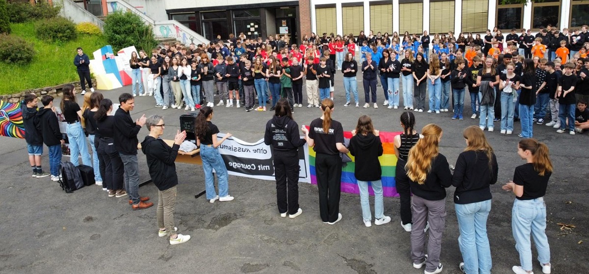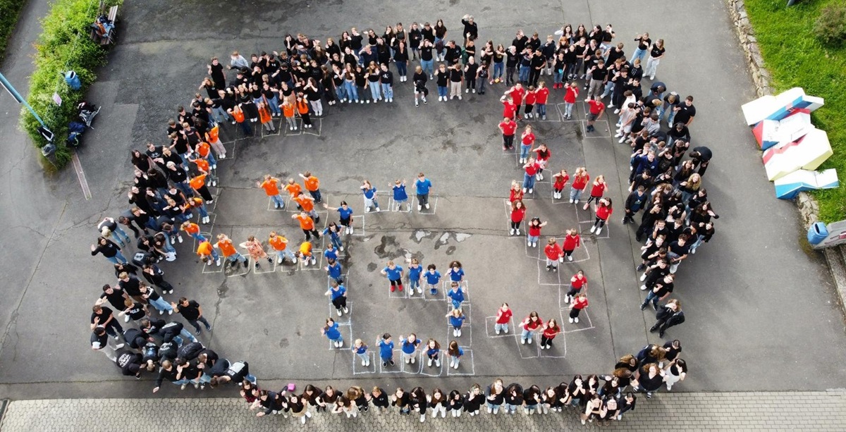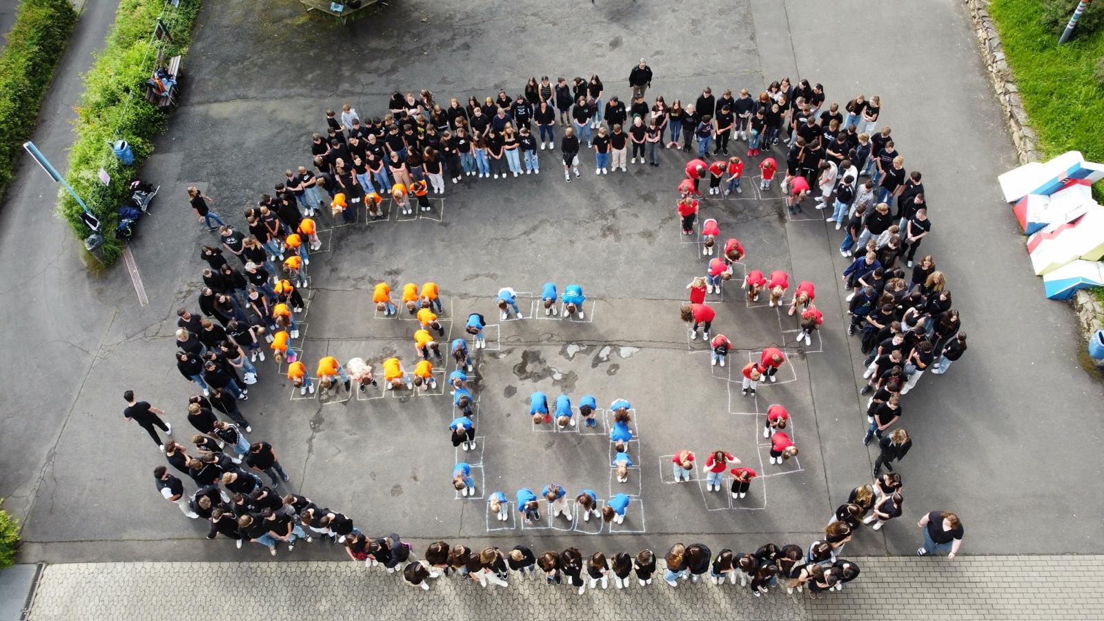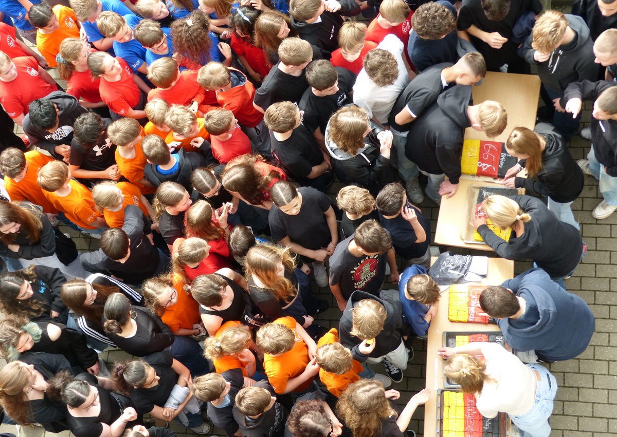 In der großen Pause fand dann der Höhepunkt unseres Aktionstages statt, der von der Schülervertretung und der AG „Schule ohne Rassismus“ (SoR) gestaltet wurde. Die gesamte Schulgemeinschaft stellte sich zu einem lebendigen Bild des Grundgesetzes zusammen. Dabei bildeten die Schülerinnen und Schüler der 5. Klassen die Grundgesetz- und Paragraphenzeichen, während der Rest der Schulgemeinschaft den Rahmen und die Seiten des Grundgesetzes darstellte. Die SoR AG unter der Leitung von Anette Heintzen informierte über die Bedeutung und Entstehung des Grundgesetzes und betonte die damit einhergehenden Freiheiten in unserer Demokratie. „Es schützt uns vor Ungleichheit und Gewalt. Grundrechte wie Meinungsfreiheit und Wählengehen sind gewährleistet. Es ist das Fundament unseres Zusammenlebens in einem freien und demokratischen Rechtsstaat. [...]“. Angesichts der aktuellen gesellschaftspolitischen Lage, rief die SoR AG dazu auf, „[...] unsere Demokratie zu verteidigen und zu stärken und gratulierte uns allen „[...] in einem demokratischen Staat mit einem Grundgesetz wie unserem Leben zu dürfen.“ Zum Abschluss wies Lydia Rörich (MSS 2) auf die stattfindende Juniorwahl und die anstehende Europawahl hin und forderte alle über 16-jährigen auf, von ihrem Wahlrecht Gebrauch zu machen, vernünftig zu wählen und ihrer Meinung Ausdruck zu verleihen. Schulleiter Jochen Wiedemann schloss sich an und betonte ebenfalls, wie wichtig es sei, gerade in den aktuellen Zeiten für die Demokratie und ihre Werte einzustehen und sich zu positionieren.