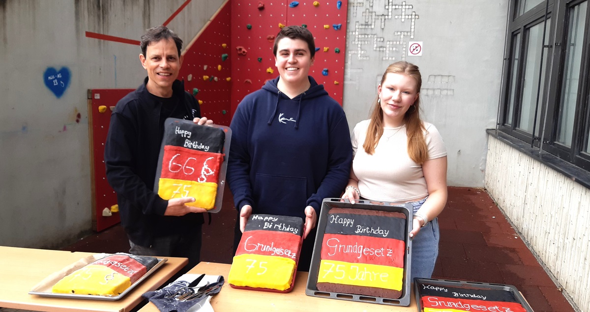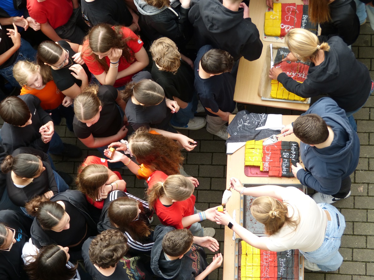 Anschließend gab es für die gesamte Schulgemeinschaft einen von unserer SV Doppelspitze (Larissa Behrens und Alexander Michels) aufwendig gebackenen und gestalteten Geburtstagskuchen in Form des Grundgesetzes und der Nationalfarben. Fünf große Backbleche wurden dafür vorbereitet und sorgten für einen süßen Abschluss der Feierlichkeiten. Ein kurzes Video dieser Aktionen wird auch unser Beitrag zum Schulwettbewerb „75 Jahre Grundgesetz“, der von der Bildungsministerin Dr. Stefanie Hubig ausgeschriebenen wurde.