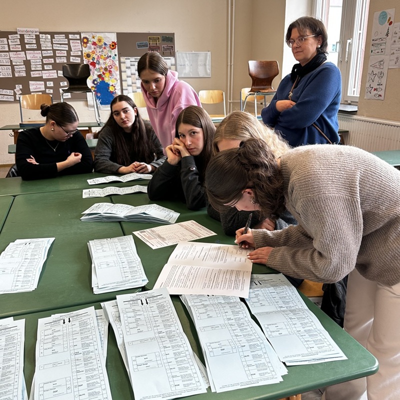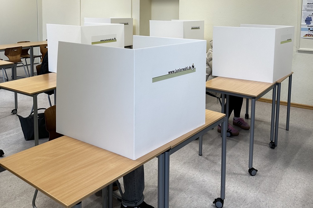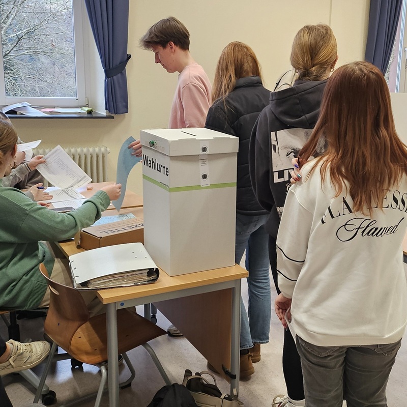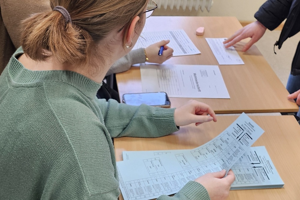 Am Wahltag selbst verwandelte sich ein Klassenraum in ein Wahllokal. Zu Beginn der ersten Stunde wartete die Gruppe Wahlhelfer gespannt auf die ersten Wählerinnen und Wähler. Diese gaben ihre Wahlbescheinigungen ab und erhielten eine kurze Einführung, bevor sie in den Wahlkabinen ihre Stimme abgaben. Dabei wurde besonders auf die korrekte Faltung des Wahlzettels und die Einhaltung der Regel „eine Person, eine Stimme“ geachtet.
