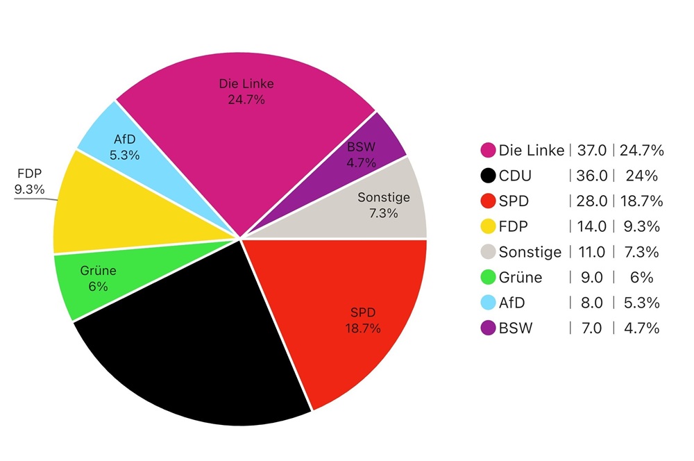 Die Ergebnisse der Juniorwahl waren aufschlussreich und zeigten sowohl interessante Unterschiede als auch Parallelen zur offiziellen Bundestagswahl. Die Linke gewann mit 24,7% der Stimmen und lag damit knapp vor der CDU, die 24% erhielt. Die SPD kam auf 18,7%. Die AfD erhielt 5,3% der Stimmen, was deutlich unter dem bundesweiten Wahlergebnis liegt. Die Grünen schnitten recht schwach ab und erhielten lediglich 6% der Stimmen. Die FDP hätte mit 9,3% der Stimmen ebenfalls einen Einzug in den Bundestag geschafft, während das BSW entsprechend dem bundesweiten Ergebnis nicht ins Parlament einzieht.