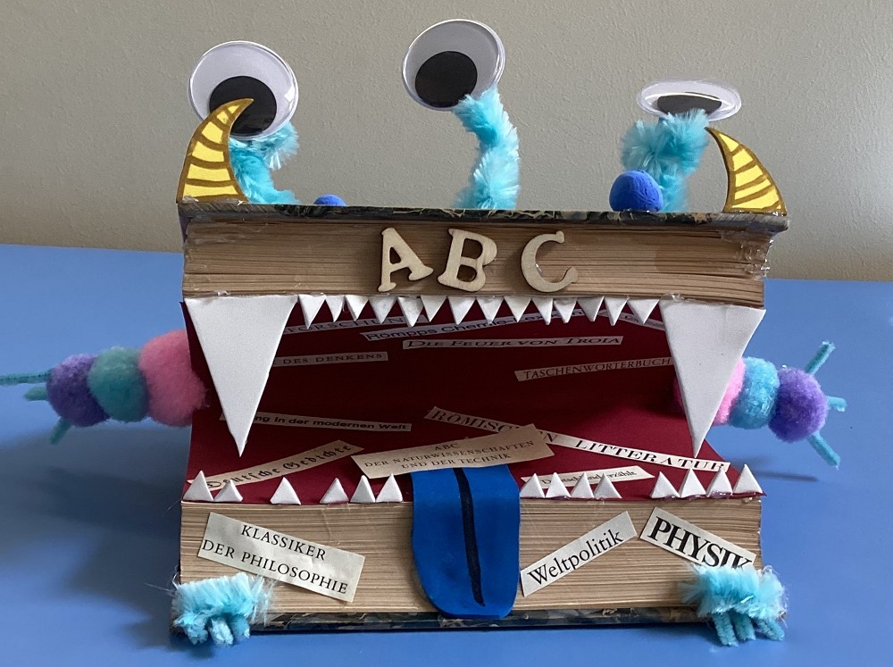Die so entstandenen Monsterchen sind der Beitrag des Bücherei-Teams zum Schülerwettbewerb der Landeshauptstadt Mainz zusammen mit dem Gutenberg-Museum. Die Buchmonster treten jetzt ihre Reise nach Mainz an und können vielleicht bald als Preisträger-Monster im Gutenberg-Museum bestaunt werden. Die Schulgemeinschaft des GymTT drückt dem Bücherei-Team die Daumen!