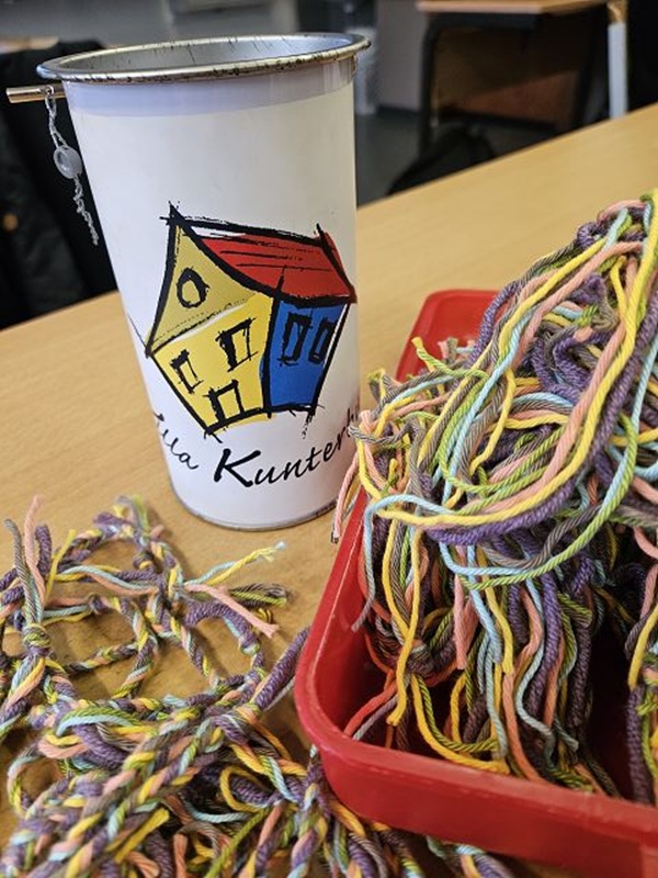 Die Mitschüler und Mitschülerinnen aus den neunten Klassen, anfangs noch skeptisch, fanden schnell Gefallen an der Aktion und lernten die Bändchen richtig zu flechten – nicht zu lose und nicht zu fest. Diese Fähigkeiten waren gefragt, denn es mussten hunderte Bändchen produziert werden, um der großen Nachfrage gerecht zu werden.