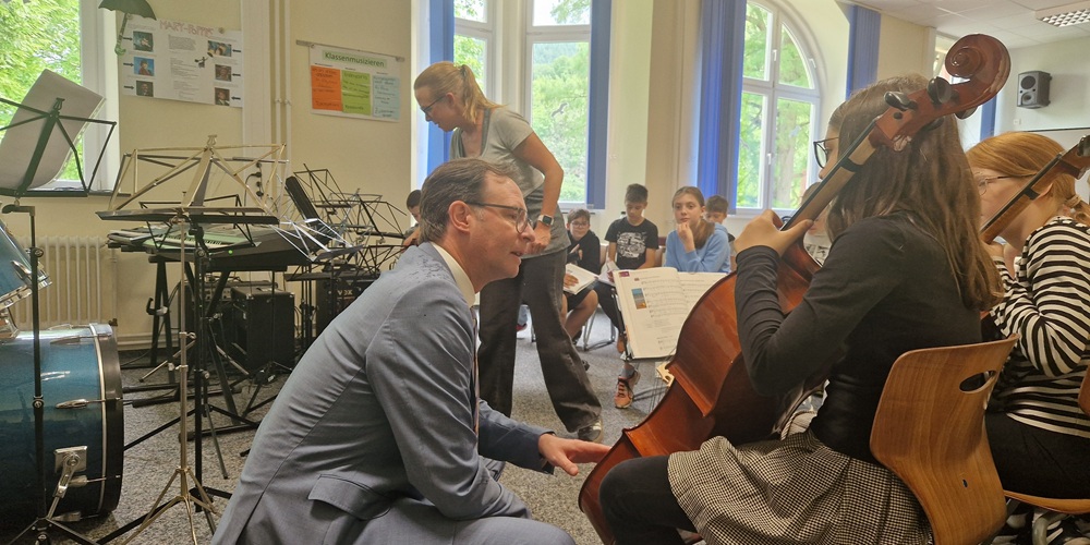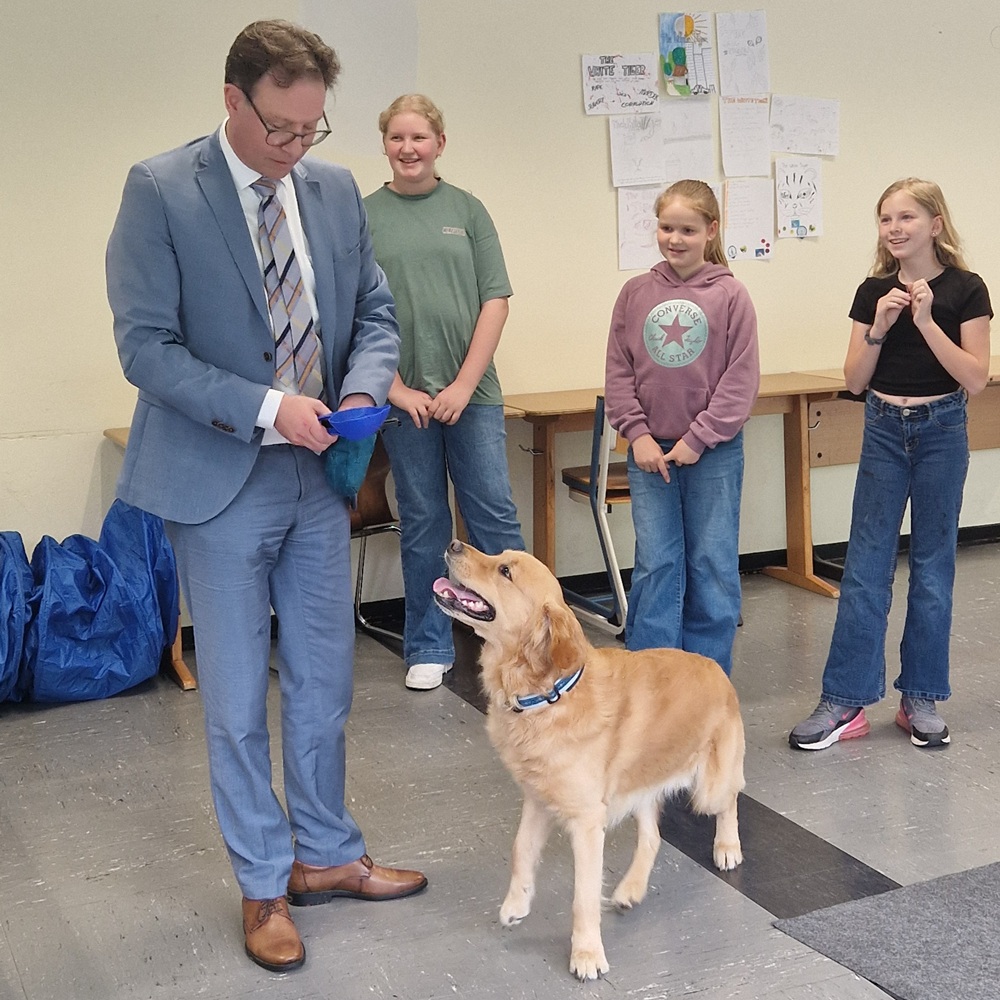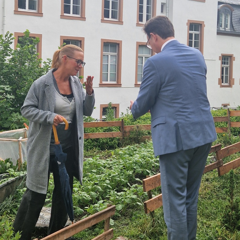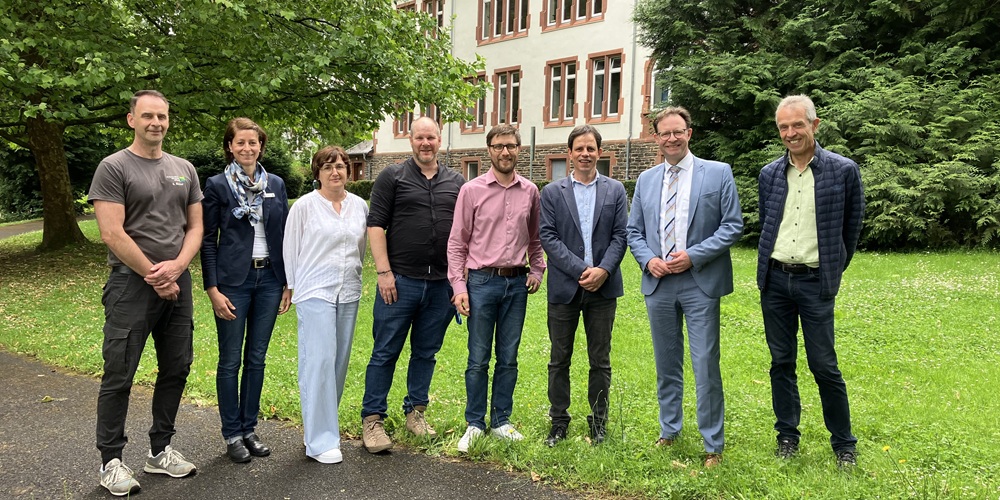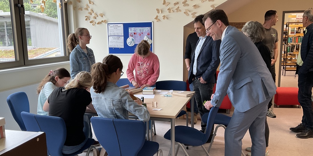 Besonderen Besuch konnte das Gymnasium Traben-Trarbach Anfang Juni willkommen heißen. Landrat Andreas Hackethal konnte sich auf seiner Schulbesuchstour durch den Landkreis ein Bild von der Schule, ihren Gebäuden und dem pädagogischen Angebot machen. Dabei gewann er auch einen Einblick in räumliche Besonderheiten des Gymnasiums Traben-Trarbach: Schulgarten, grünes Klassenzimmer, Lernzeiträume und der Bibliotheksbereich mit der neuen MSS-Bibliothek wurden besichtigt. Ein Rundgang (mit Abstecher beim Büchereiteam und der Schulhund-AG) und die anschließende Gesprächsrunde mit Hausmeister, Schulsekretärin und Schulleitung boten Gelegenheiten zum gegenseitigen Kennlernen und zum Ideenaustausch. Begleitet wurde Landrat Hackethal von der Leiterin des Geschäftsbereichs „Kommunales, Bildung, Kultur und Jugend“ der Kreisverwaltung, Frau Stefanie Sakwerda, sowie den Fachbereichsleitern Stefan Schmitt (Bildung und Kultur) und Burkhard Born (Gebäudemanagement und Kreisstraßen).