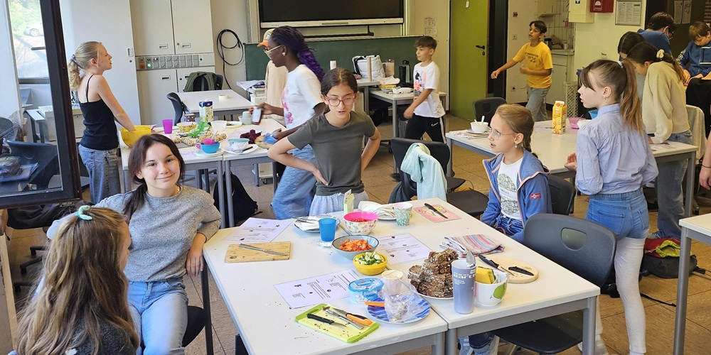 Zum Abschluss setzten die Sechstklässler ihr Wissen genussvoll in Szene: Gemeinsam gestalteten sie ein abwechslungsreiches Frühstücksbuffet mit Wraps, Vollkornspießen, Obstsalat, Smoothies und kleinen Energiekugeln. In geselliger Runde ließen sie sich ihr selbst zubereitetes Buffet schmecken – ein köstlicher Höhepunkt dieser lehrreichen Tage.