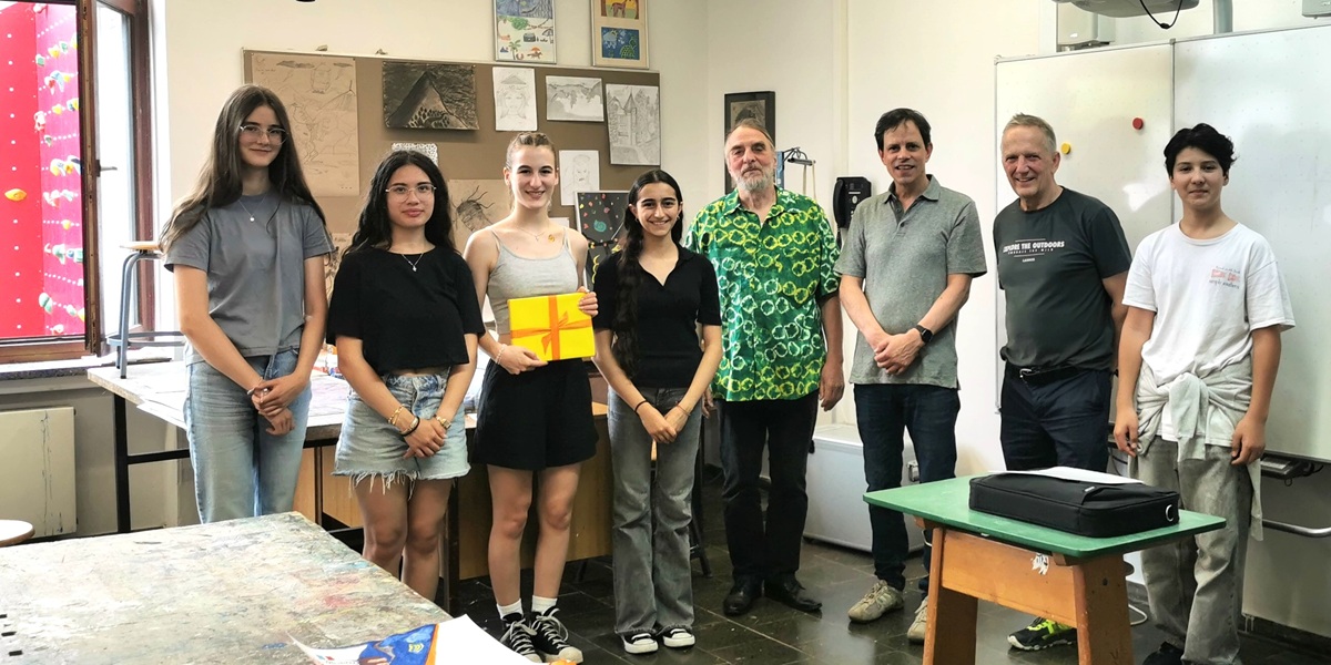 Ein besonders persönlicher Moment ereignete sich am 25. Juni 2025 während seiner letzten Kunstwerkstatt-AG: Der Schulleiter OStD Jochen Wiedemann, Ganztagsschulkoordinator StD Uwe Ohrem sowie eine Delegation der Schülervertretung besuchten Herrn Werner, überreichten ihm ein Präsent und überbrachten den Dank der gesamten Schulgemeinschaft. Auf dem dazu entstandenen Foto ist Herr Werner an vierter Stelle von rechts, Herr Wiedemann an dritter Stelle von rechts und Herr Ohrem an zweiter Stelle von rechts zu sehen.