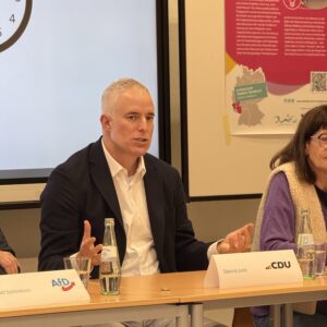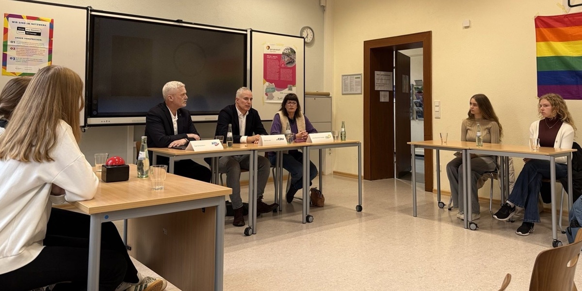 Am 03.11.25 bot das Gymnasium Traben-Trarbach seinen Schülerinnen und Schülern erneut die Möglichkeit, Landespolitik unmittelbar zu erleben. Zur Podiumsdiskussion begrüßte Schulleiter Jochen Wiedemann die Landtagsabgeordneten Jutta Blatzheim-Roegler (Bündnis 90/Die Grünen), Dennis Junk (CDU) sowie Ralf Schönborn (AfD). Die langjährige Teilnehmerin Tamara Müller (SPD) konnte aus Termingründen in diesem Jahr leider nicht teilnehmen. In seiner Begrüßungsrede hob Herr Wiedemann die besondere Verantwortung der Schule hervor. Das Gymnasium stehe für eine offene und vielfältige Gemeinschaft – an der Schule und gesamtgesellschaftlich. Er verwies in diesem Zusammenhang auf die Mitgliedschaft im Netzwerk „Schule ohne Rassismus – Schule mit Courage“. Demokratiebildung sei ein zentrales Anliegen der Schule und es seien sich alle bewusst, dass Demokratie aktuell dringender denn je verteidigt werden müsse.